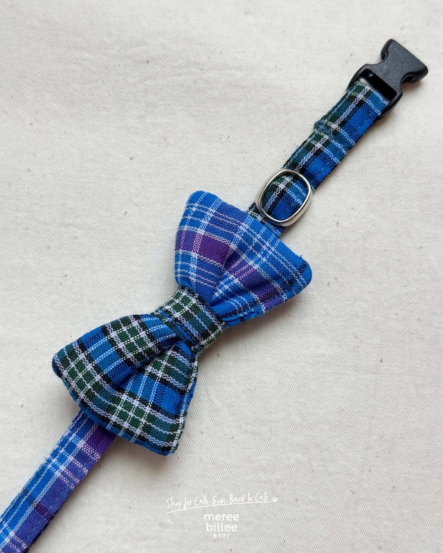 【クールな雰囲気のブルーチェック】リボン付き首輪 *シュシュはオプションでお選びいただけます ソフトなコットン生地を使用し、硬い芯地などを一切使わず、全体的に柔らかな質感に仕上げています。 首輪がはじめての猫ちゃんや、首輪を嫌がる猫ちゃんにもおすすめ。猫ちゃんへの負担を最小限に抑えた、やさしいつけ心地です。 猫ちゃんの首輪には、安全アジャスターを採用しており、力が加わると外れる設計になっています。約4.5キログラムの力で外れるため、万が一の時にも安心です。 *ランダムなパッチワーク商品ですので、一点一点、色や柄の出方に個体差がございます *全て手作業で仕上げているため、商品のサイズに若干のばらつきや、縫製にムラが見られることがありますが、職人の手作業による温もりをご理解いただけると幸いです *軽量で柔らかい作りになっており、負荷がかかるとバックルが外れる仕様となっています。散歩や係留用としてはご使用いただけません *開封直後は染料の香りが感じられる場合がございます。こちらは猫ちゃんに害のあるものではございませんので、安心してご使用ください 【猫ちゃん用 首輪】 ■サイズ:最小 約20 cm〜最大 約30 cm(リボン部分:幅 約7〜8 cm) ■テープ幅:約1 cm ■重さ:約5~6 g ■留め具:セーフティ・アジャスター ■素材 テープ・リボン:綿100% バックル:金属 留め具:樹脂製(POM(ポリアセタール)) *安全設計で『もしも』の時も安心 首輪が引っ掛かり、力が加わると外れるセーフティ・アジャスターを使用しています。アジャスターは、アメリカの高品質ブランド「Duraflex(デュラフレックス)」社製で、柔軟性があり割れにくい樹脂素材を使用しています。 【飼い主さん用シュシュ】 ■サイズ:約20 cm ■テープ幅:約4~5 cm ■素材:綿100% *首の細い子や子猫ちゃんにつきましては、シュシュも猫ちゃん用としてご使用いただけます。 猫ちゃんの体調や首回りのサイズに合わせて、無理なくご判断いただけますと幸いです。 ■原産国:インド ■返品について:ご購入前にサイドバーより "SHOPPING GUIDE" をご一読ください。 ■注意事項: ●サイズ調節の際は無理に引っ張らず優しくお取り扱いください。●ご使用を繰り返すうちに色が褪せることがございます。●強い日光や照明を長時間受けますと変色の可能性がございますのでお気をつけください。●漂白剤や蛍光増白剤の入った洗剤は使用しないでください。色落ちや変色の原因となる可能性がございます。●濡れたまま放置しないでください。●この製品はインド製です。生地には織りムラやネップ、プリントのズレやインク飛びなどが見受けられる場合がございます。またサイズにも多少の誤差があることをご了承ください。●職人の手作業による温かみのある独特の風合いをお楽しみください。