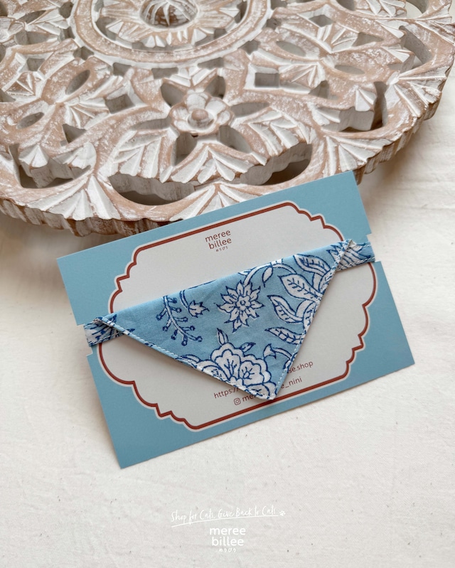 裏表リバーシブル仕様の猫用バンダナ首輪。 【爽やかで上品なアイスブルー】 店主がインドでセレクトしたブロックプリント生地を2柄組み合わせ、表も裏も楽しめるリバーシブルバンダナタイプの猫用首輪です。 前、後ろ、横、どの角度でも可愛く、2つの表情を楽しめるデザイン。猫ちゃんのボディカラーやコーディネートに合わせて自由に使えます。 柔らかく軽やかなコットン素材で、首輪がはじめての猫ちゃんや、首輪を嫌がる猫ちゃんにもおすすめ。猫ちゃんへの負担を最小限に抑えた、やさしいつけ心地です。 安全アジャスターを採用しており、力が加わると外れる設計になっています。約4.5キログラムの力で外れるため、万が一の時にも安心です。 また、「つけるのはできるけど、外すのが大変!」という猫ちゃんにもおすすめ。少し引っ張るだけで外せるので、首輪練習中の子にもぴったりです。 *ランダムカット商品ですので、一点一点、色や柄の出方に個体差がございます。 *全て手作業で仕上げているため、商品のサイズに若干のばらつきや、縫製にムラが見られることがありますが、職人の手作業による温もりをご理解いただけると幸いです。 *軽量で柔らかい作りになっており、負荷がかかるとバックルが外れる仕様となっています。散歩や係留用としてはご使用いただけません。 *開封直後は、ブロックプリントならではの染料の香りが感じられる場合がございます。こちらは猫ちゃんに害のあるものではございませんので、安心してご使用ください。 【猫ちゃん用 首輪】 ■サイズ:最小 約 27 cm〜最大 約 32 cm(バンダナ部分:長さ 約 6 cm) ■テープ幅:約 1 cm ■重さ:約 7 g ■留め具:セーフティ・アジャスター ■素材 本体:綿 100 % バックル:金属 留め具:樹脂製(POM(ポリアセタール)) *安全設計で『もしも』の時も安心 首輪が引っ掛かり、力が加わると外れるセーフティ・アジャスターを使用しています。アジャスターは、アメリカの高品質ブランド「Duraflex(デュラフレックス)」社製で、柔軟性があり割れにくい樹脂素材を使用しています。 ■原産国:インド ■ご購入前にサイドバーのABOUTより "SHOPPING GUIDE" をご一読ください。 ■注意事項: ●サイズ調節の際は無理に引っ張らず優しくお取り扱いください。●ご使用を繰り返すうちに色が褪せることがございます。●ブロックプリント特有の天然染料の香りを感じることがありますが、ご使用のうちに自然と薄れていきます。気になる場合は、ご使用前に風通しの良い場所で軽く天日干ししてください。●強い日光や照明を長時間受けますと変色の可能性がございますのでお気をつけください。●漂白剤や蛍光増白剤の入った洗剤は使用しないでください。色落ちや変色の原因となる可能性がございます。●濡れたまま放置しないでください。●この製品はインド製です。生地には織りムラやネップ、プリントのズレやインク飛びなどが見受けられる場合がございます。またサイズにも多少の誤差があることをご了承ください。●職人の手作業による温かみのある独特の風合いをお楽しみください。