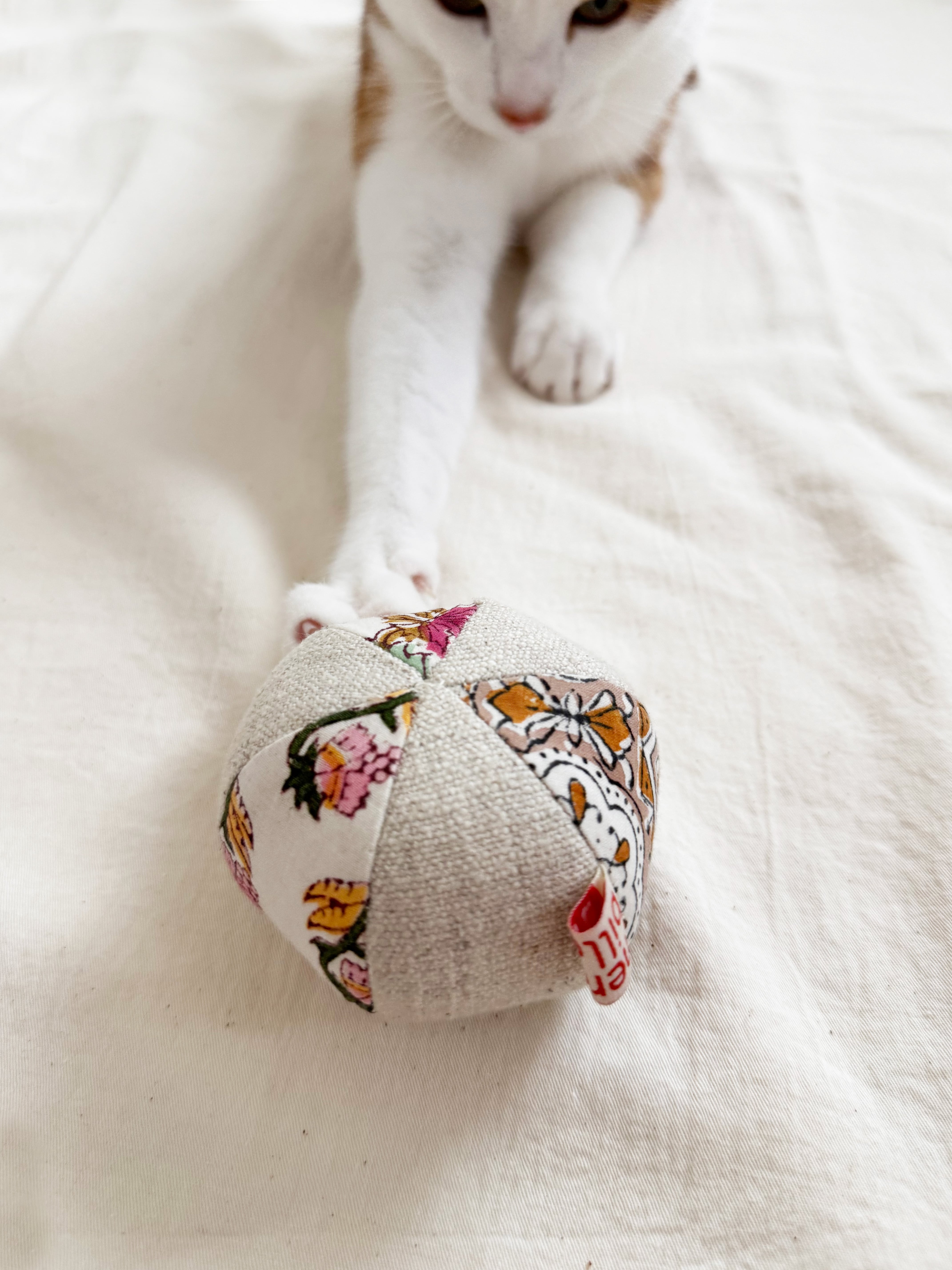 インドの伝統技法「ブロックプリント」のファブリックと、厚手のリネン生地を組み合わせた、落ち着いたニュアンスカラーのパッチワーク仕立て猫用ボールおもちゃです。