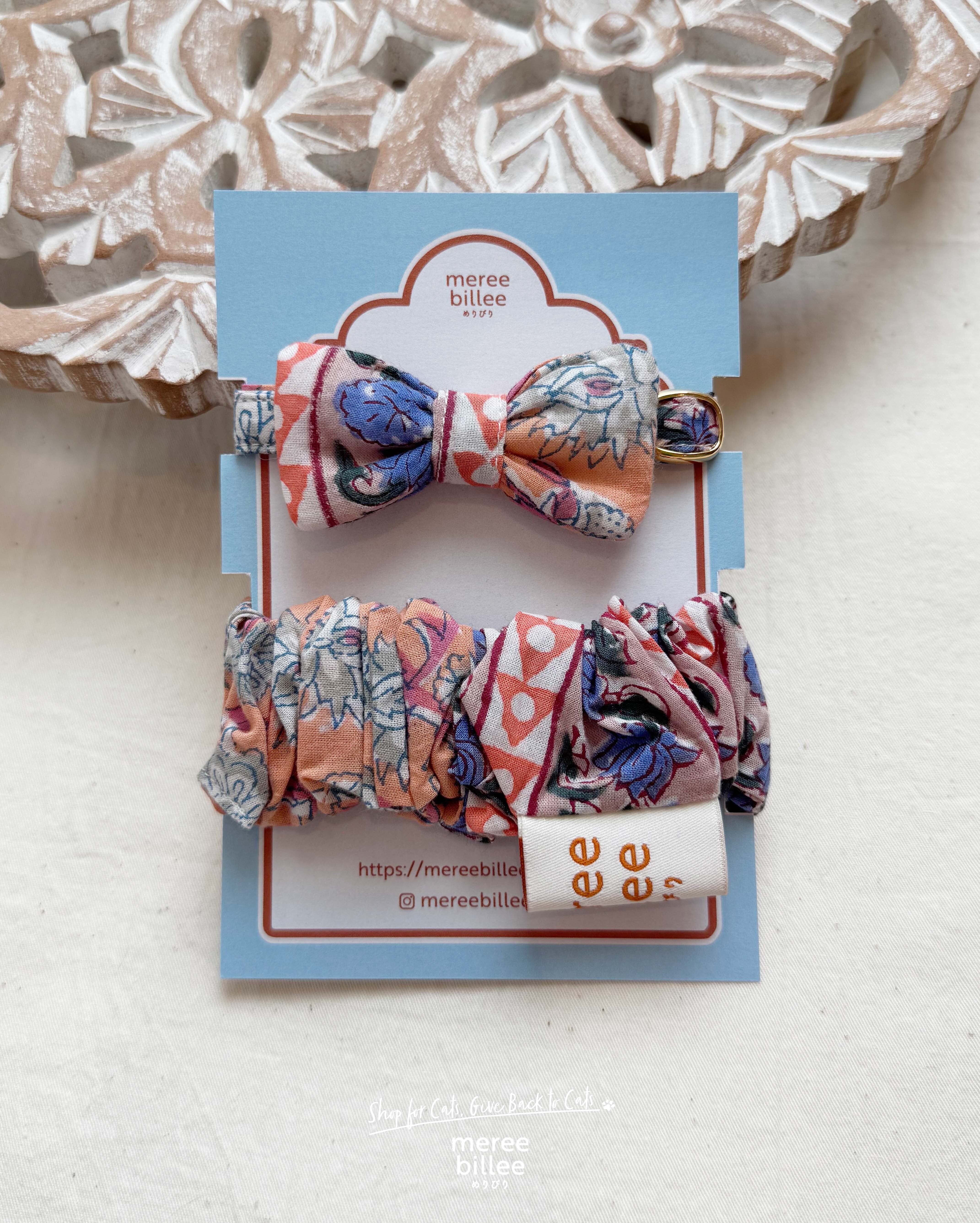 猫用リボン付き首輪&シュシュセット|肌にやさしいコットン素材 【サーモンピンク】