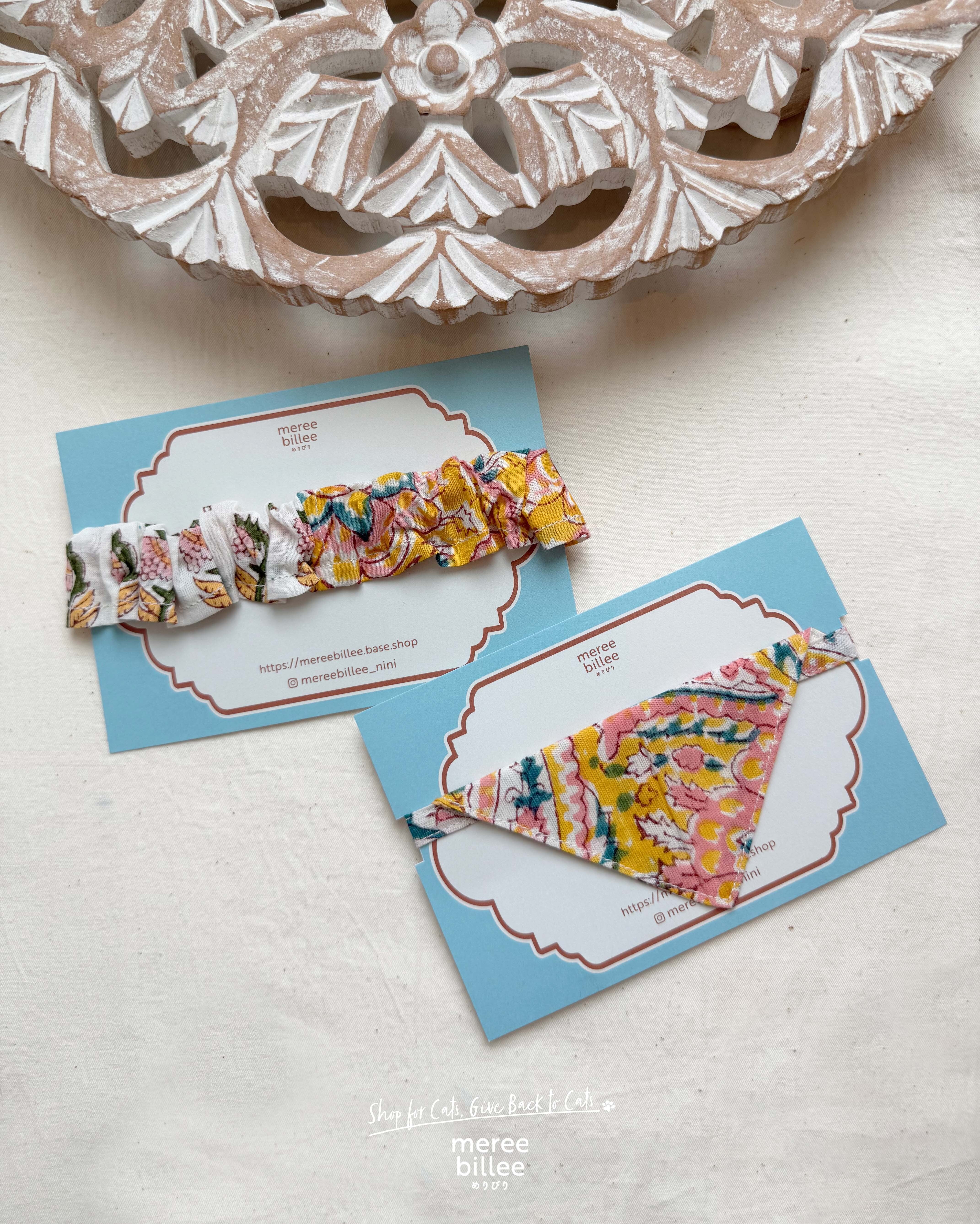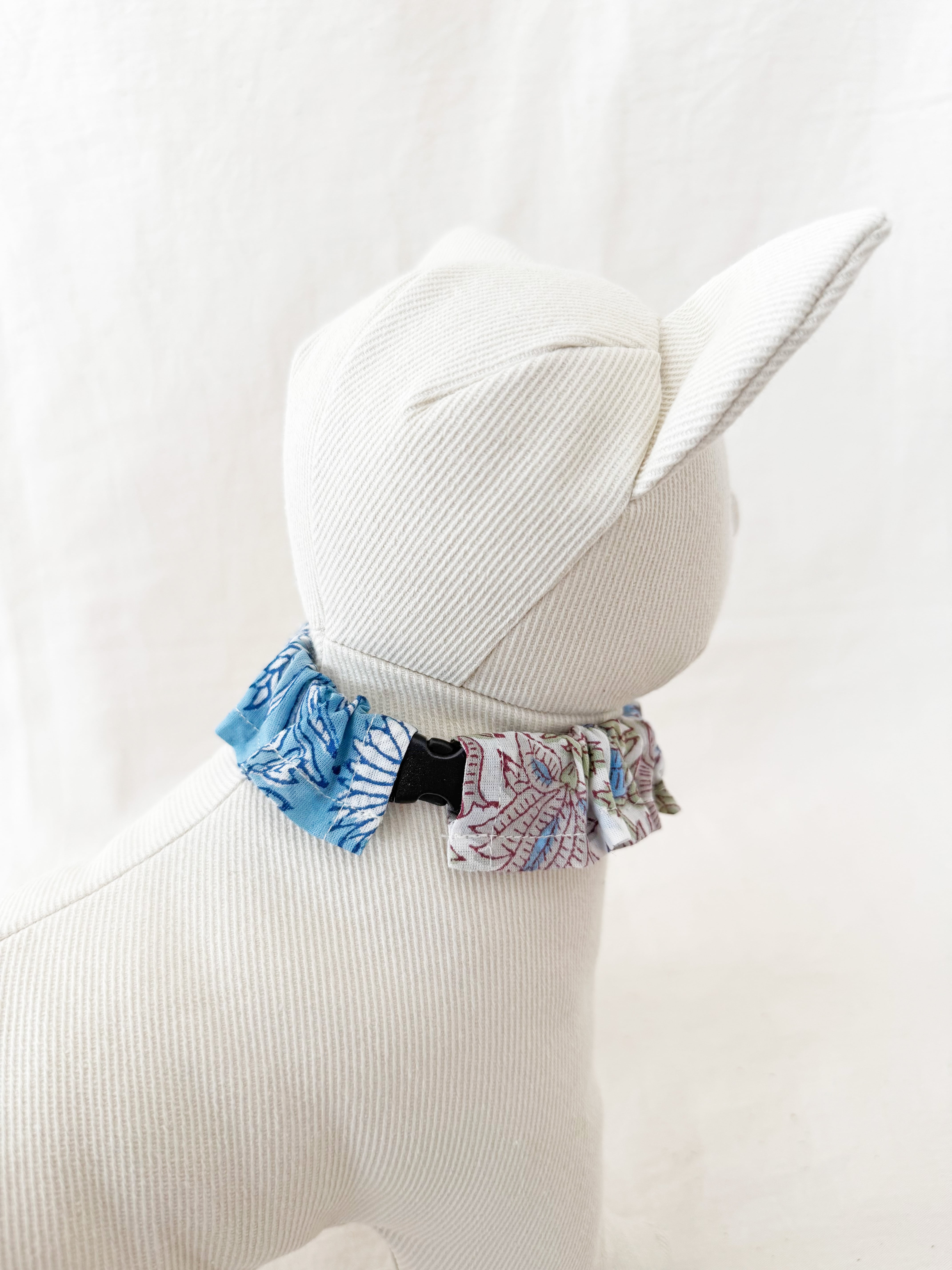 ブロックプリント生地を2柄組み合わせ、見る角度によって異なる表情を楽しめる猫用フリル首輪。