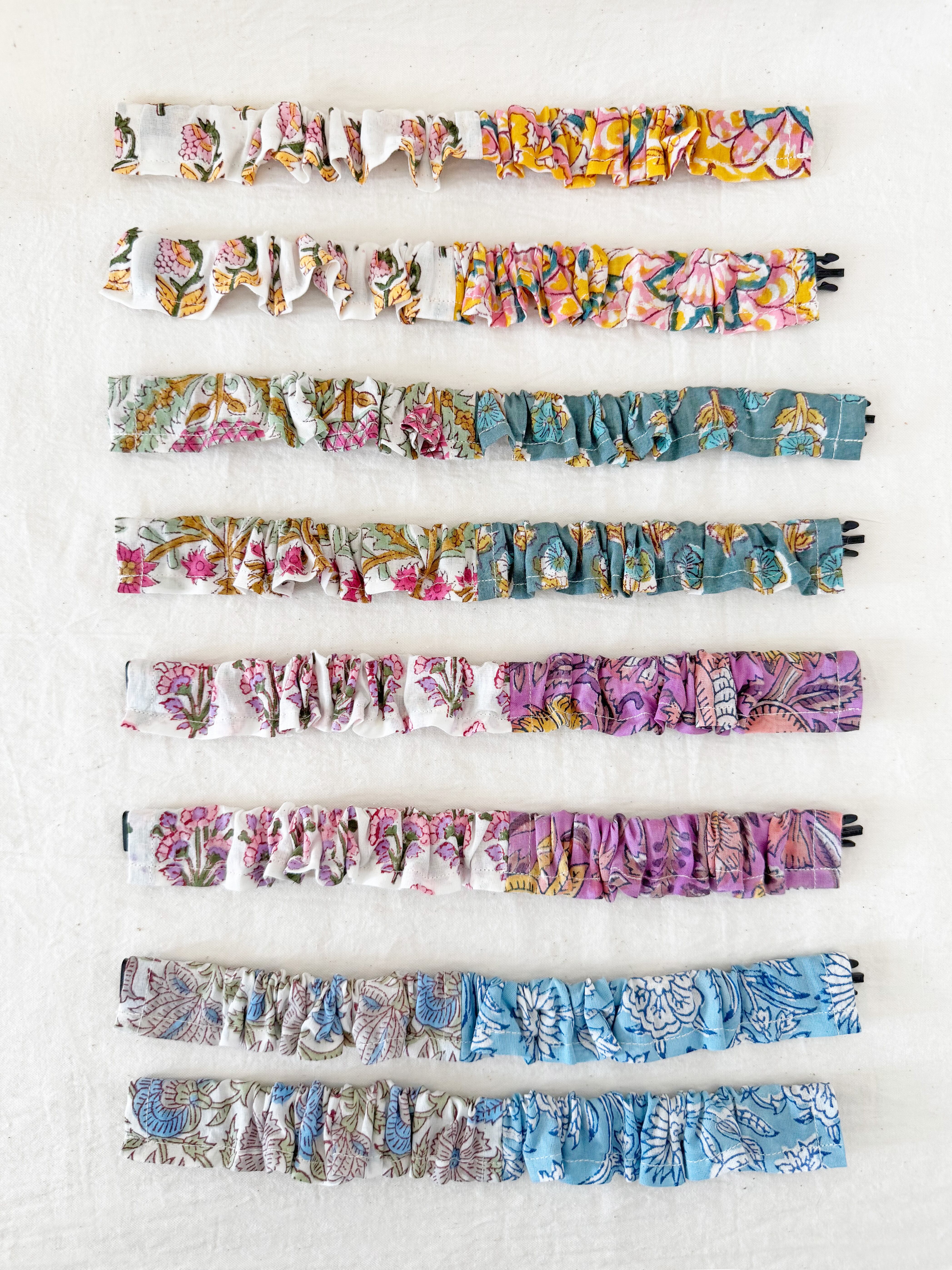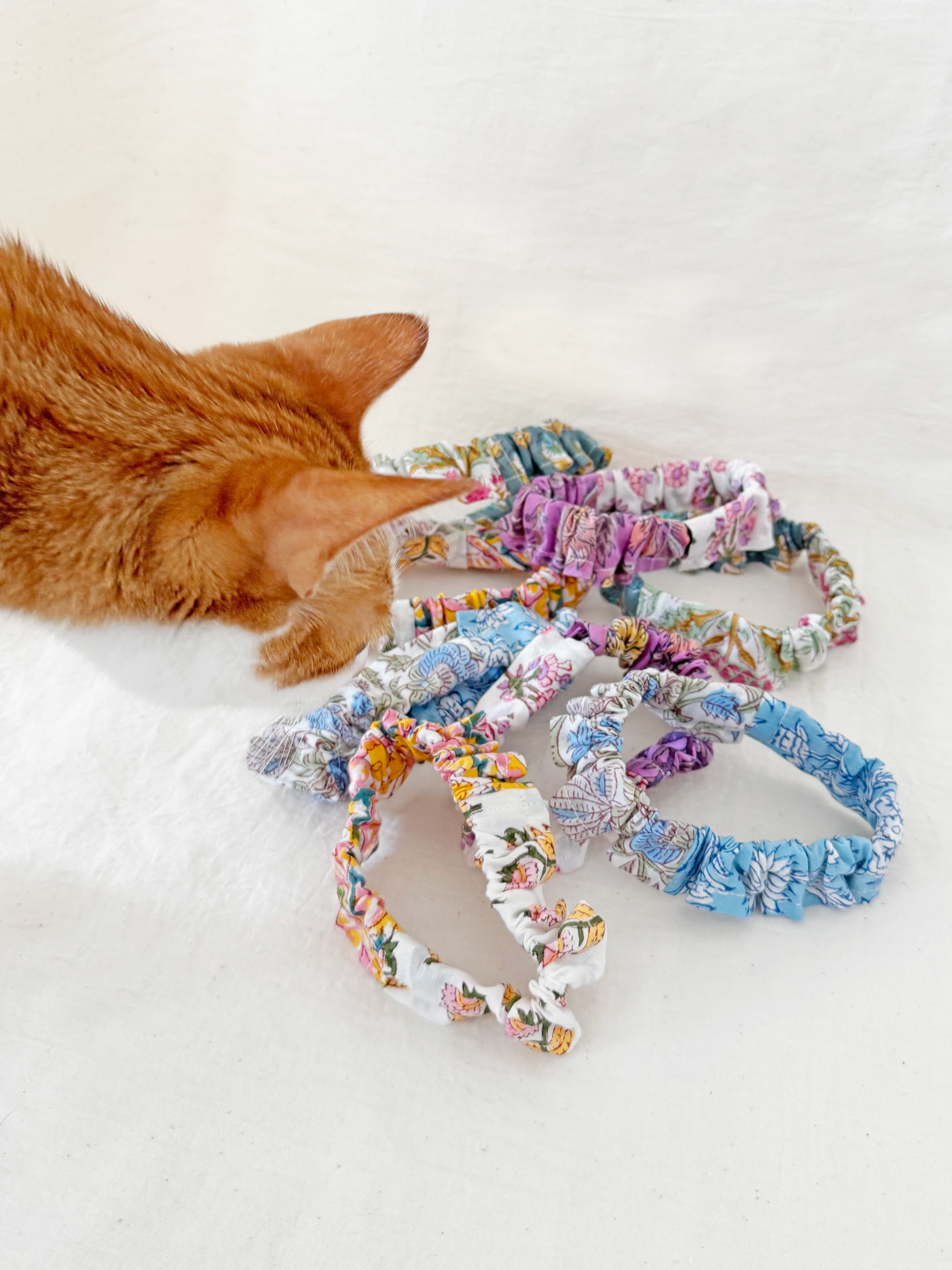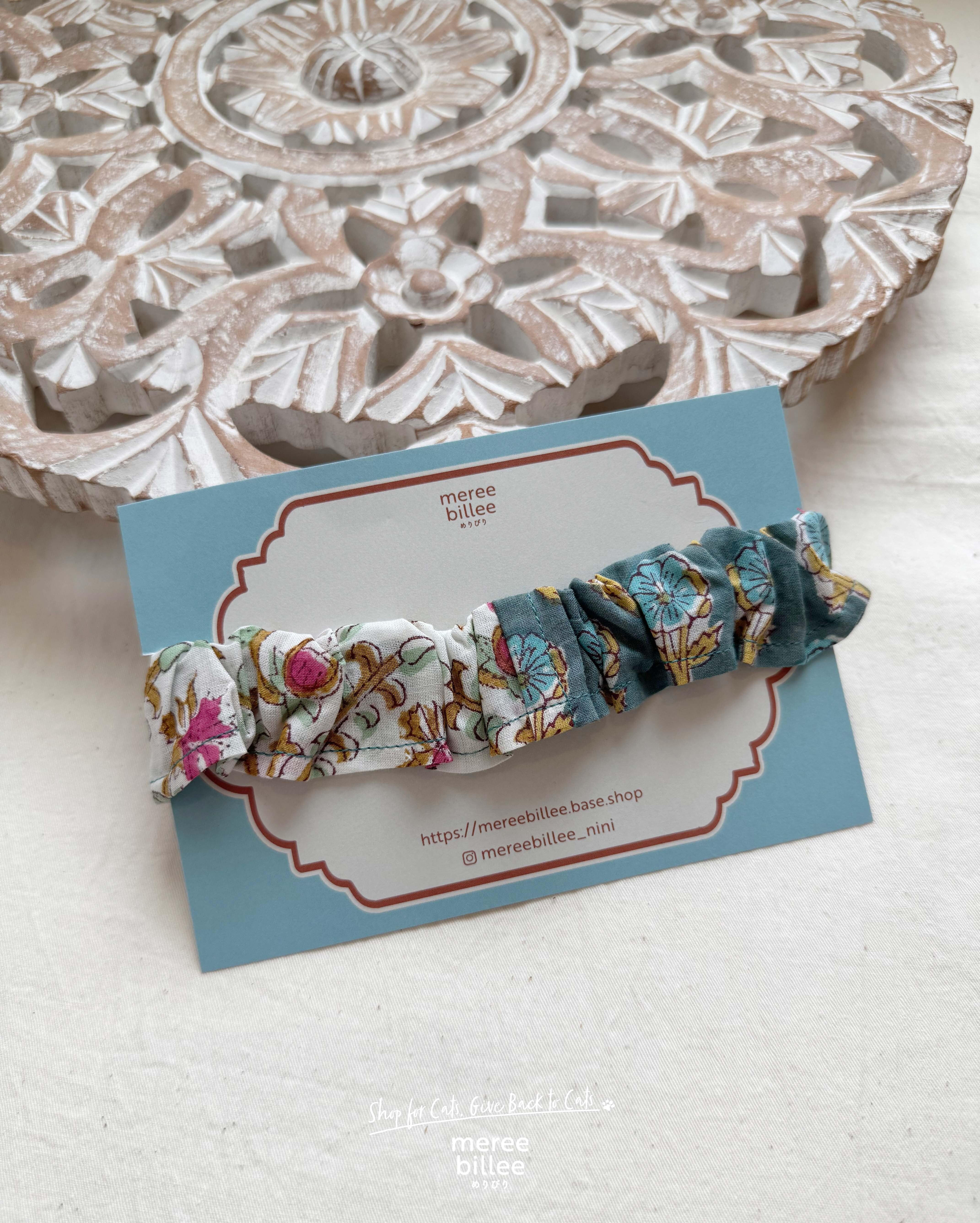 ブロックプリント生地を2柄組み合わせ、見る角度によって異なる表情を楽しめる猫用フリル首輪。