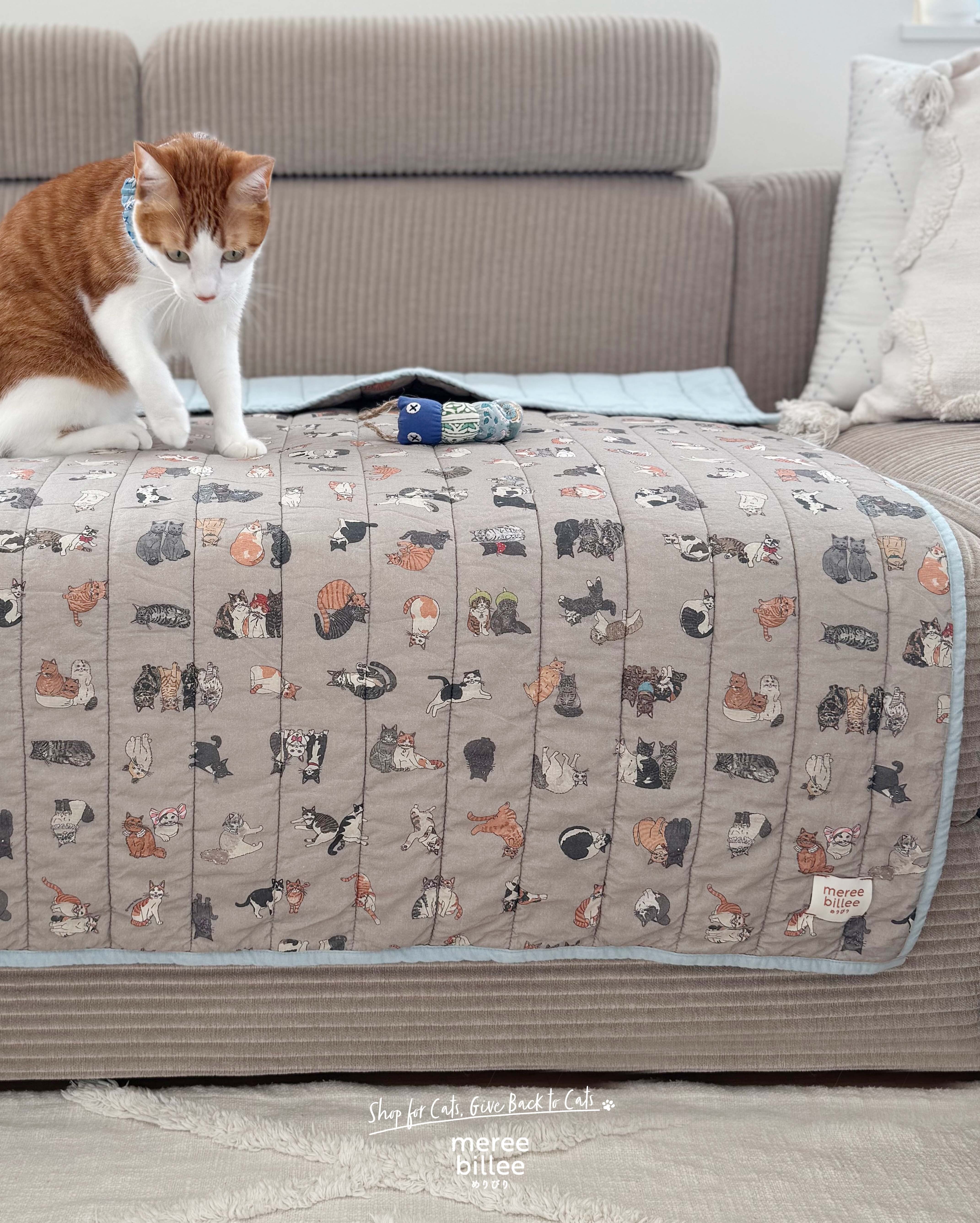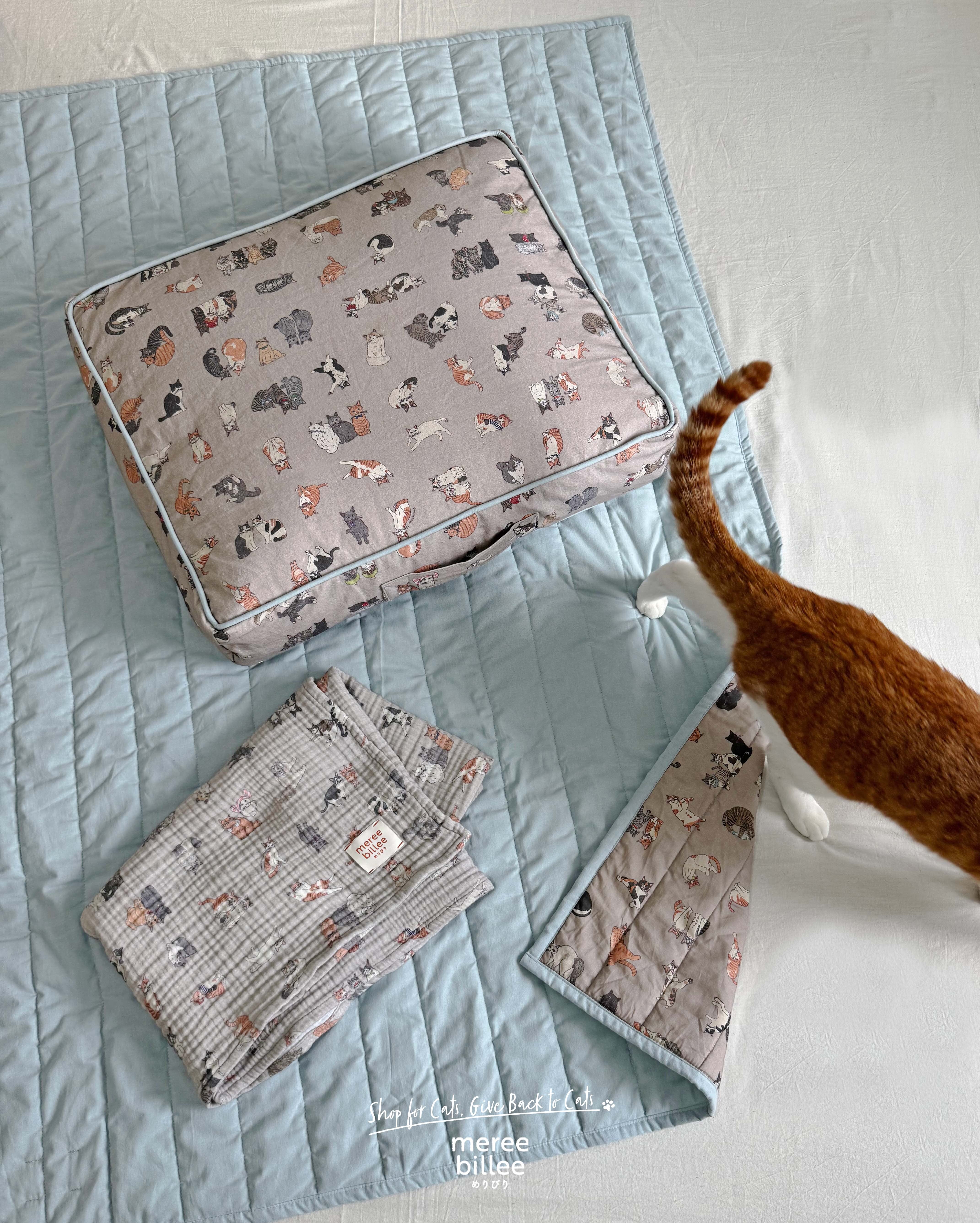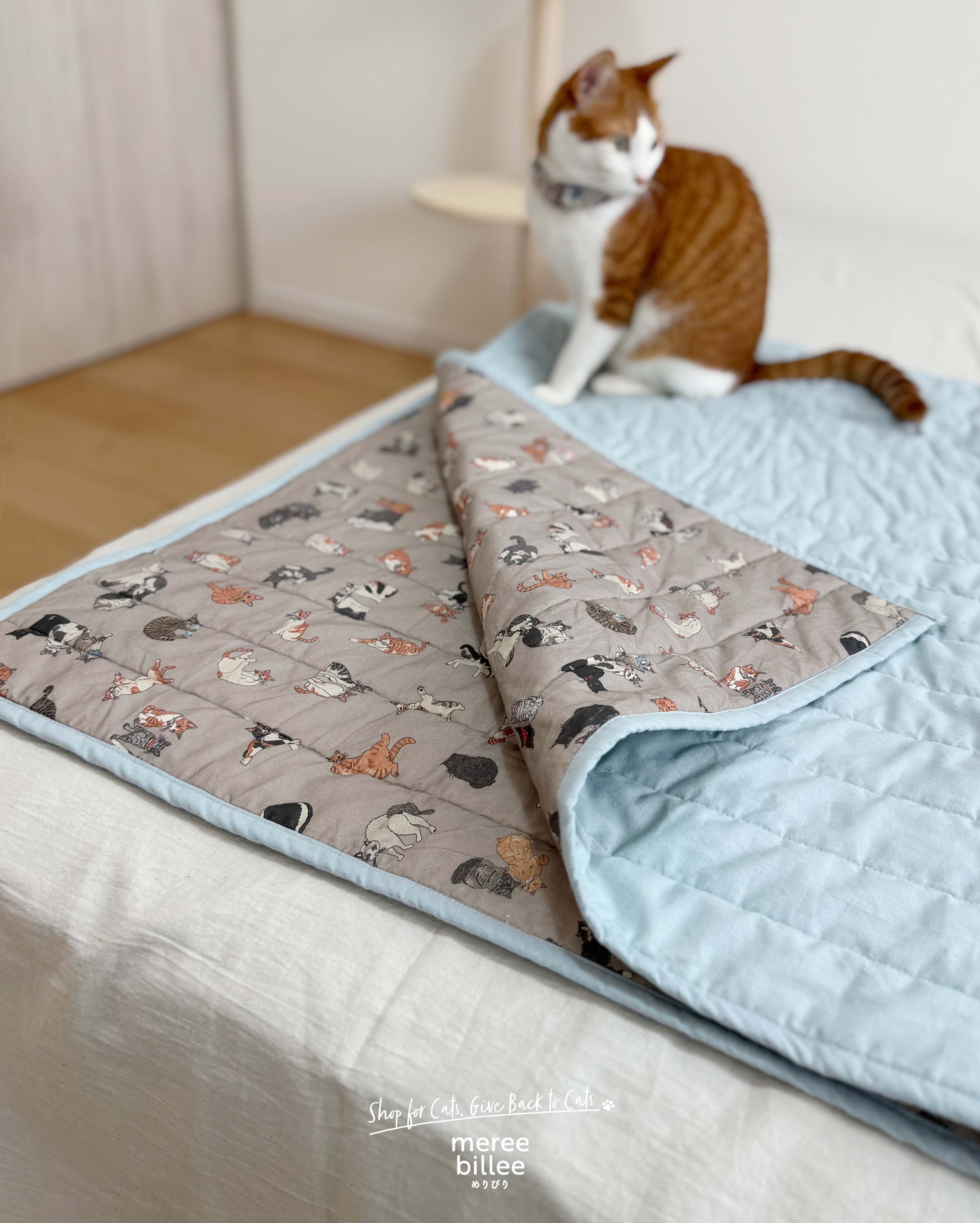 meree billeeでしか手に入らない、特別な猫柄キルトブランケットです。