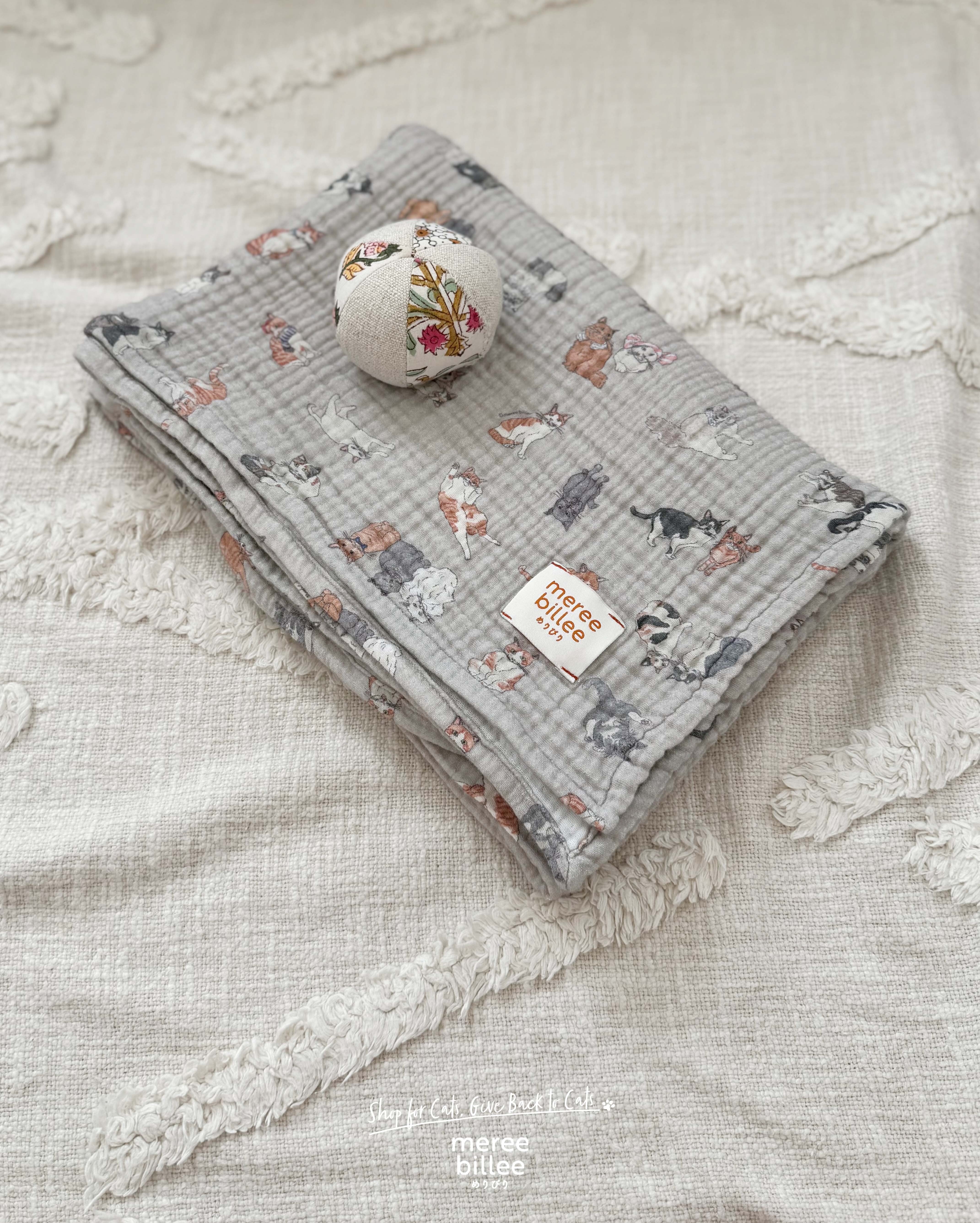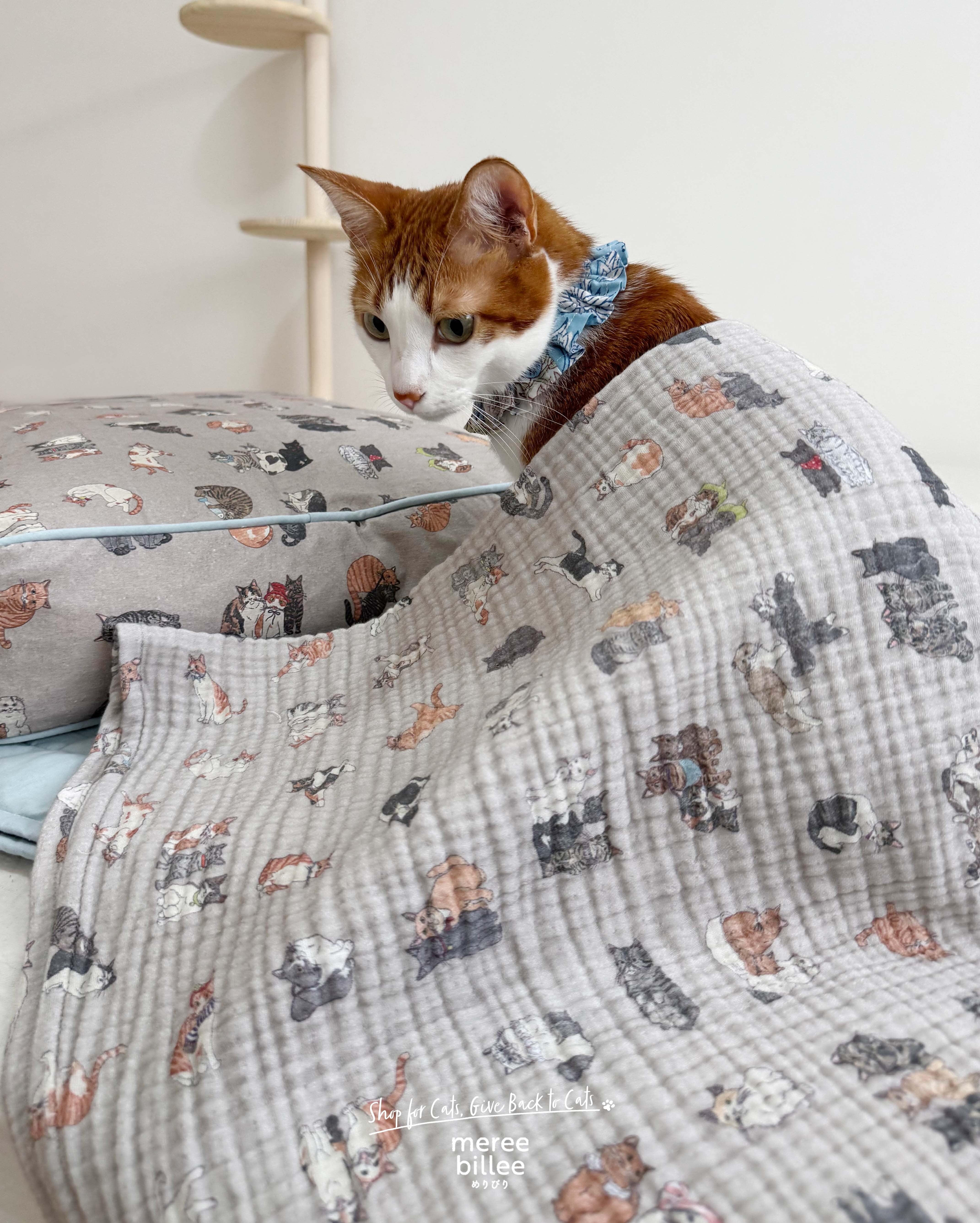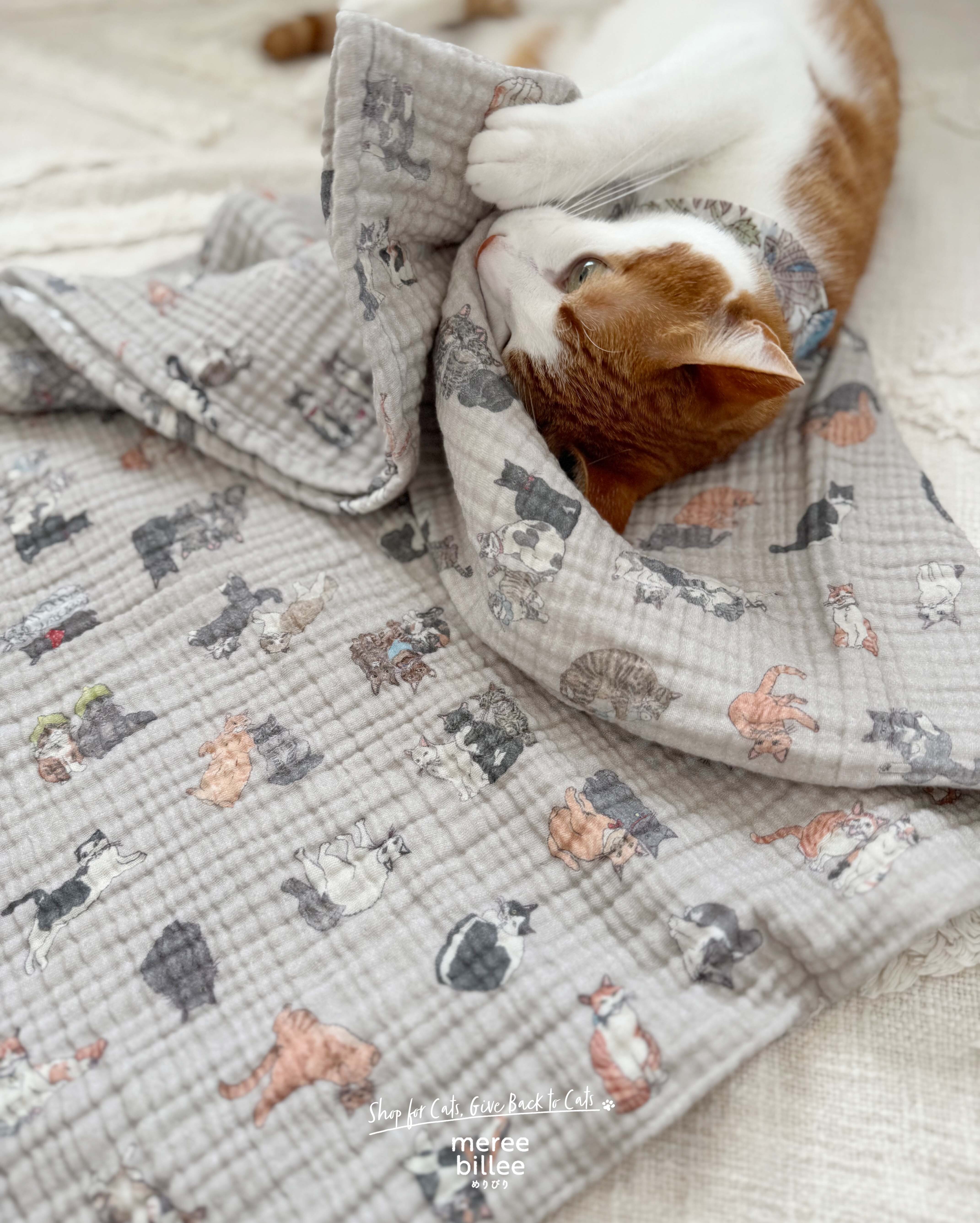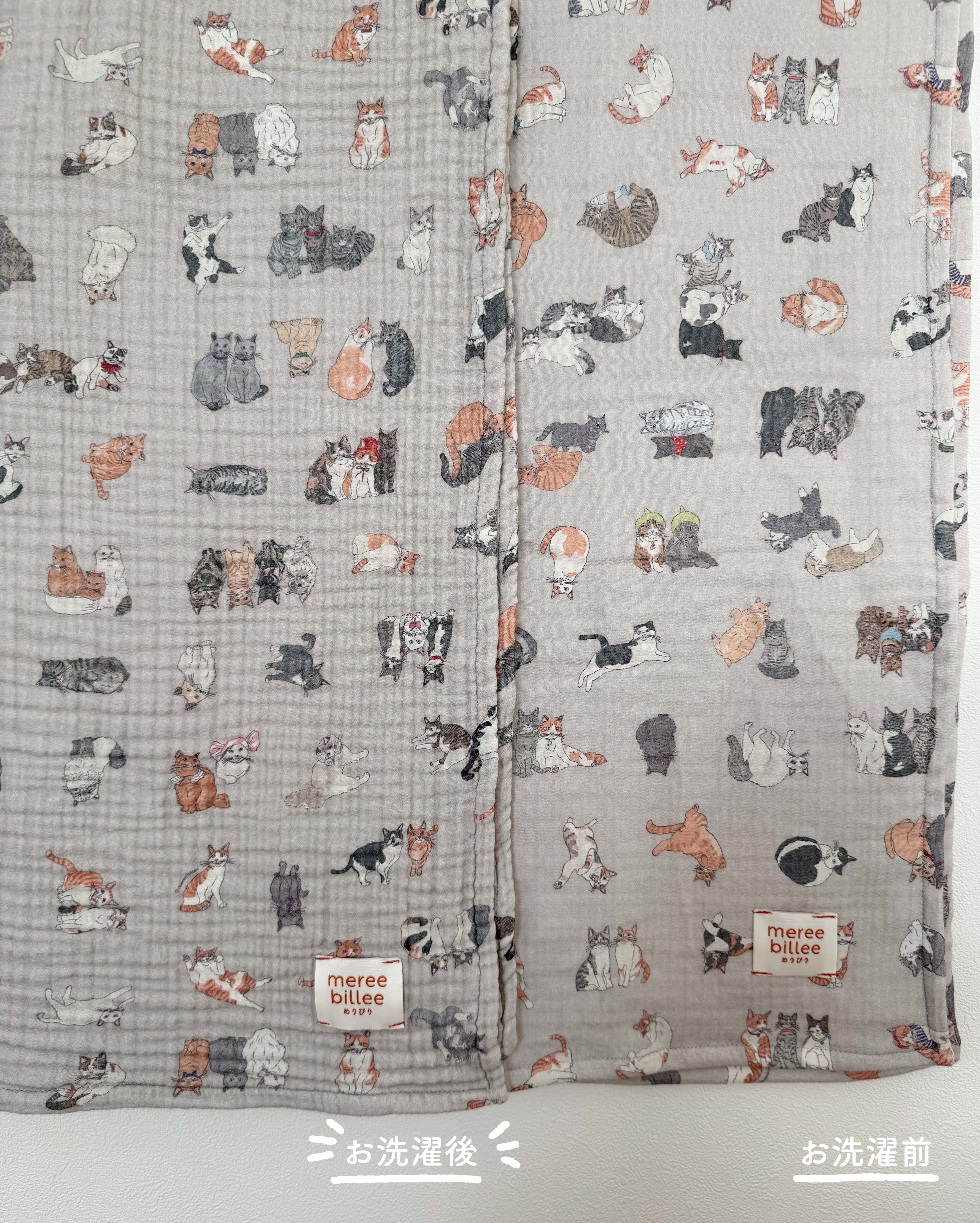 meree billeeでしか手に入らない、特別な猫柄ガーゼブランケットです。