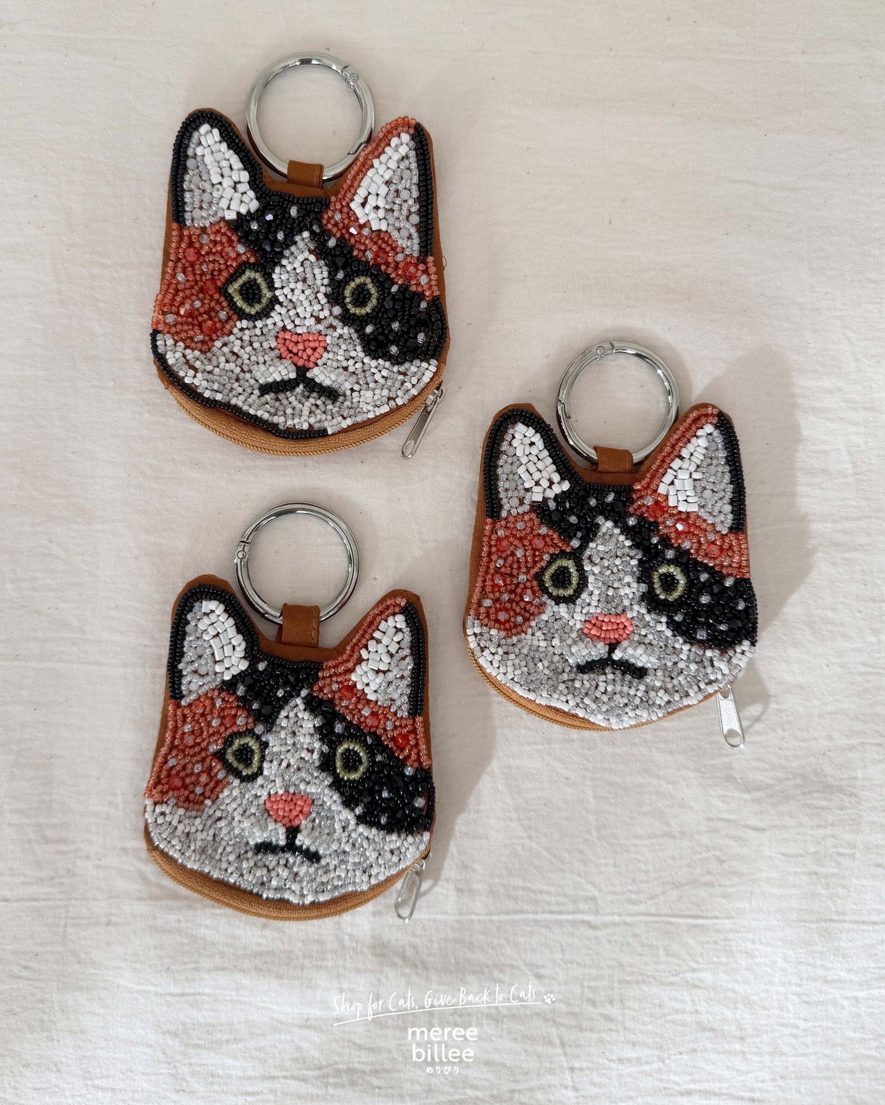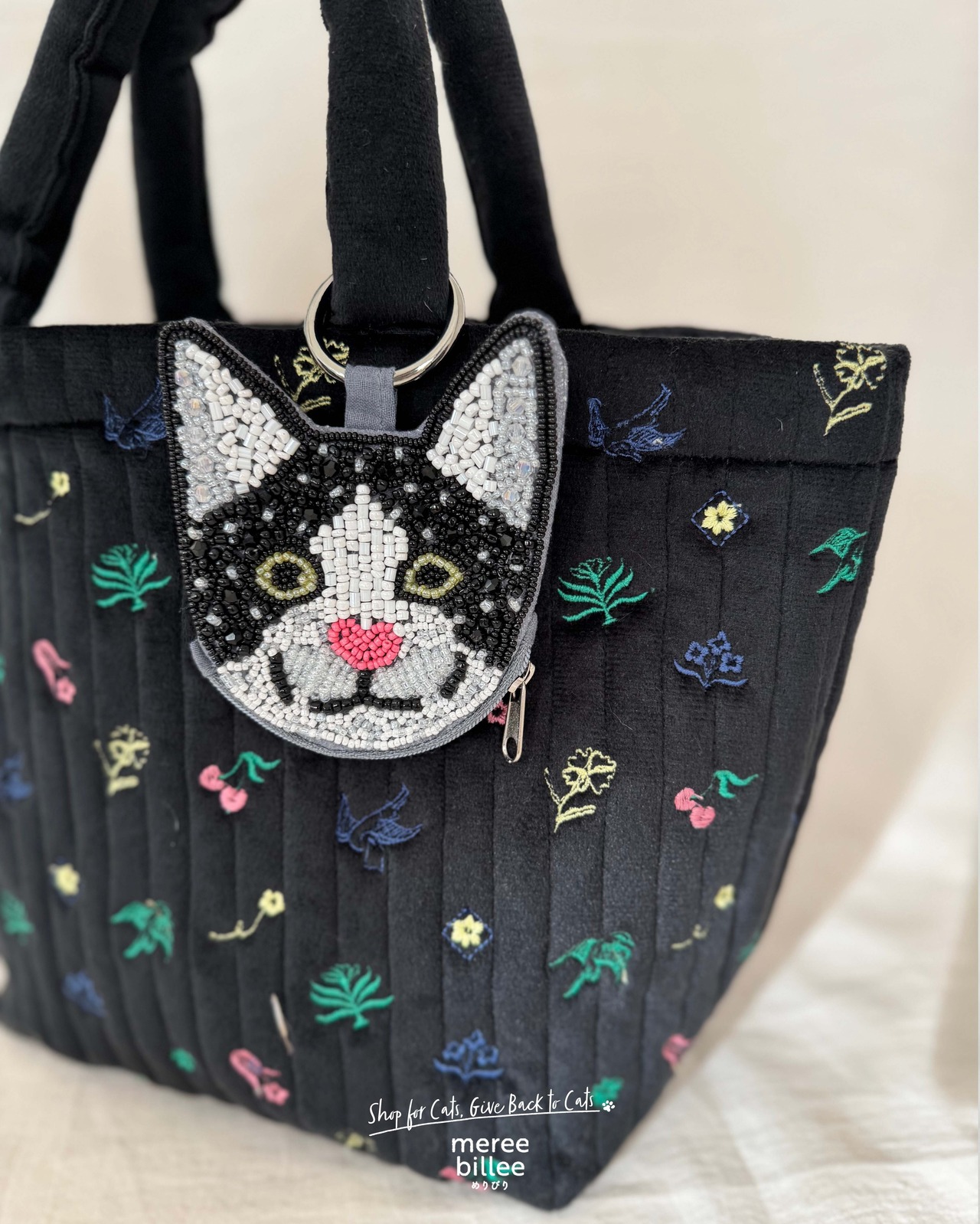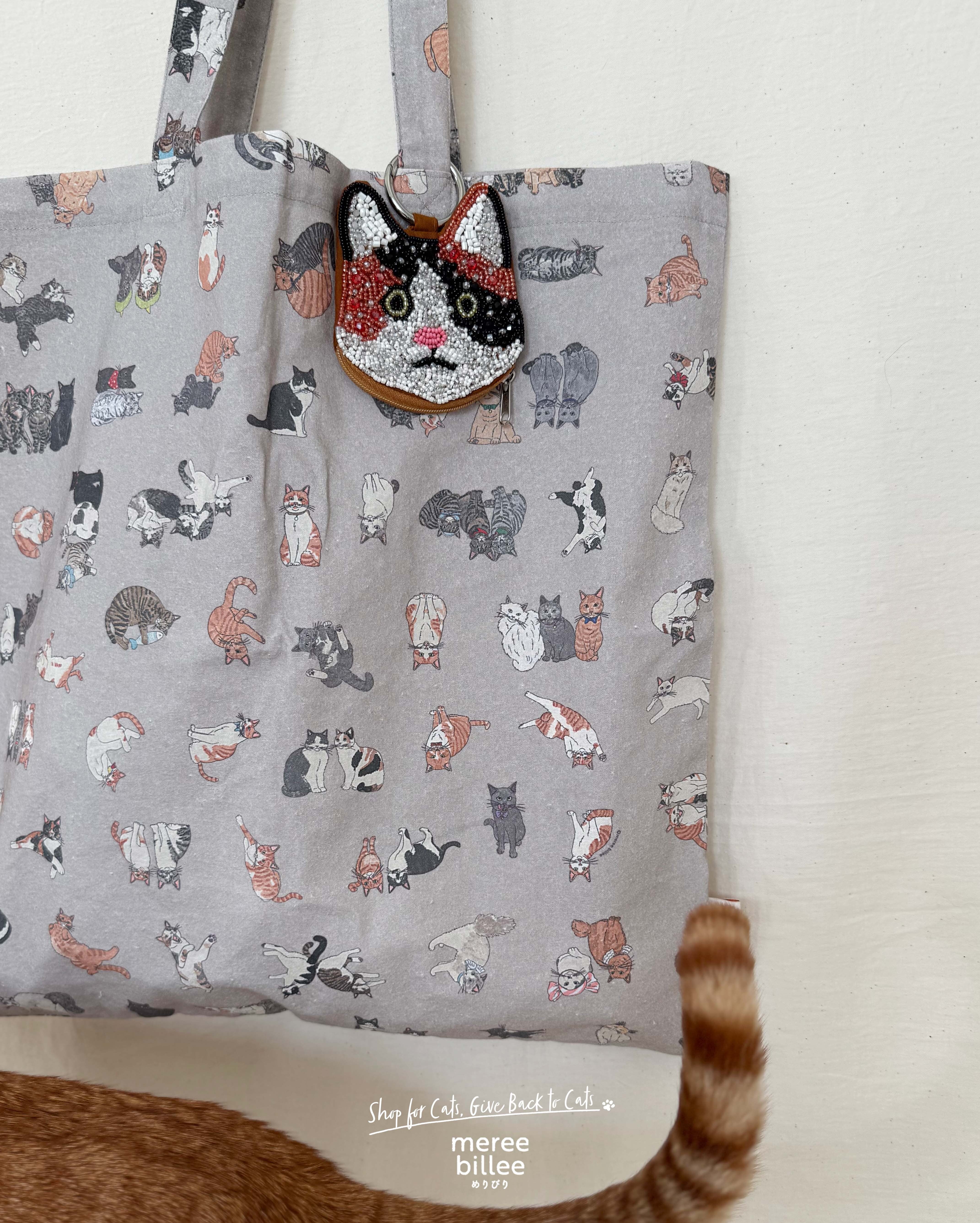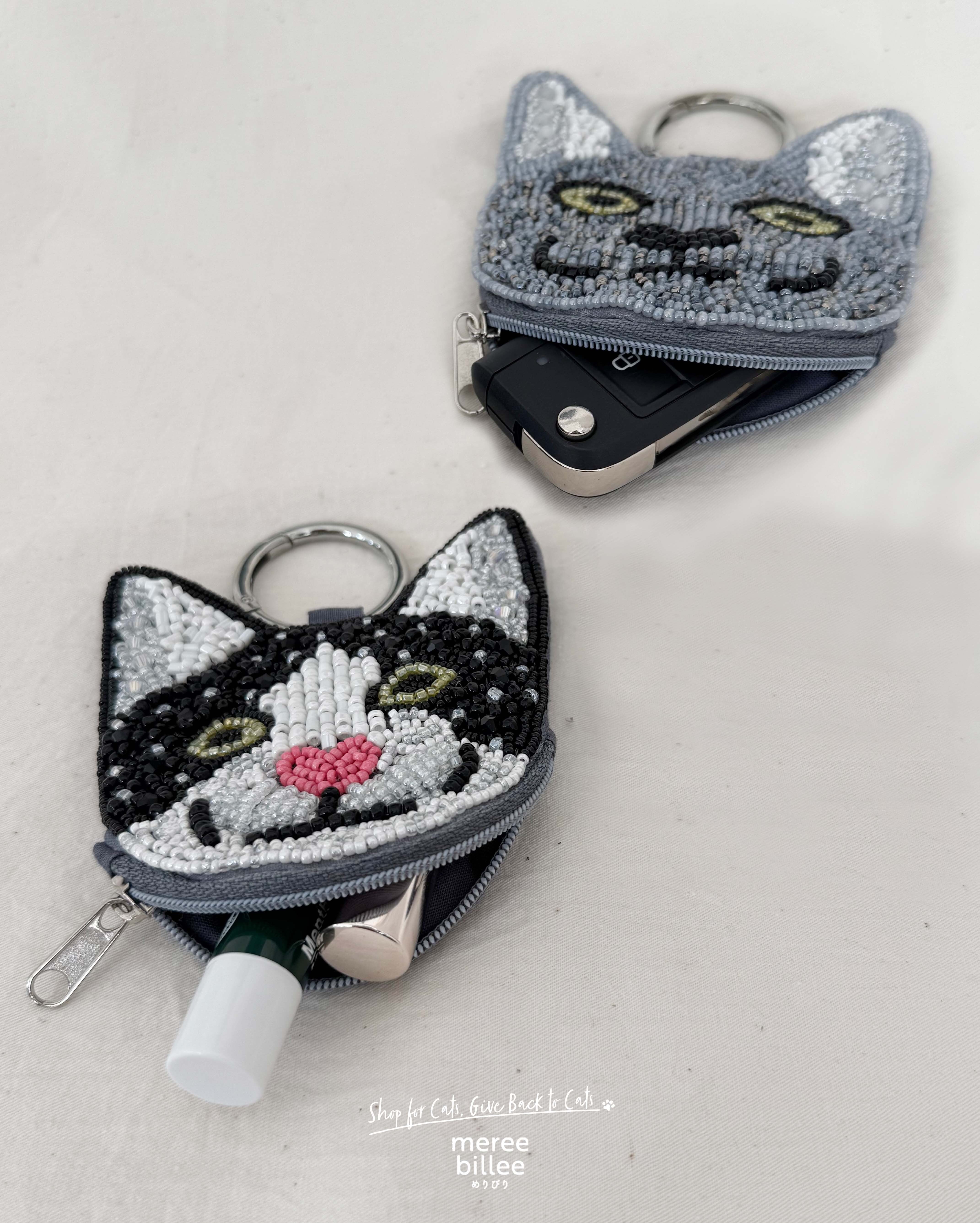 キラキラのビーズ刺繍が愛らしい、猫型ミニポーチです。