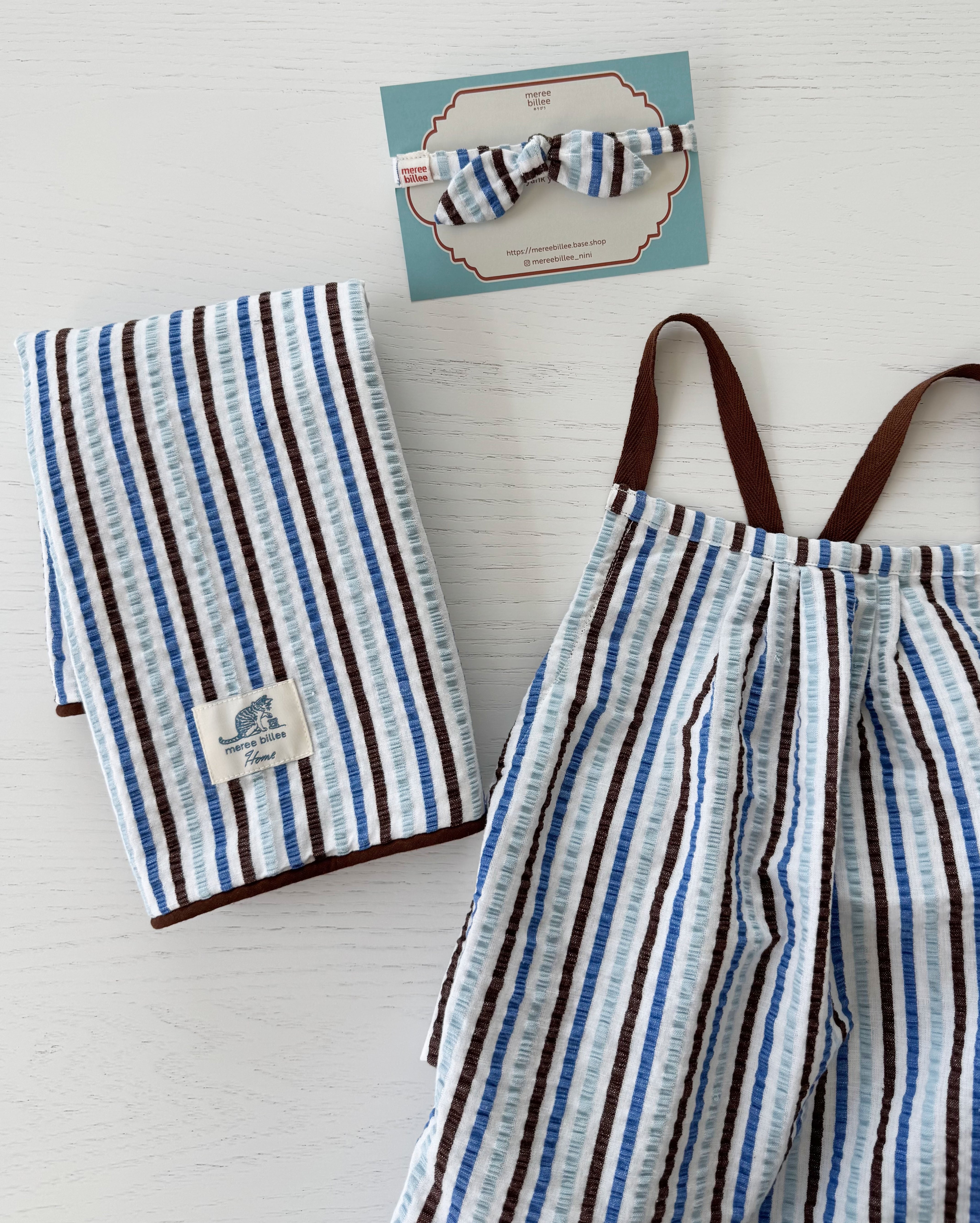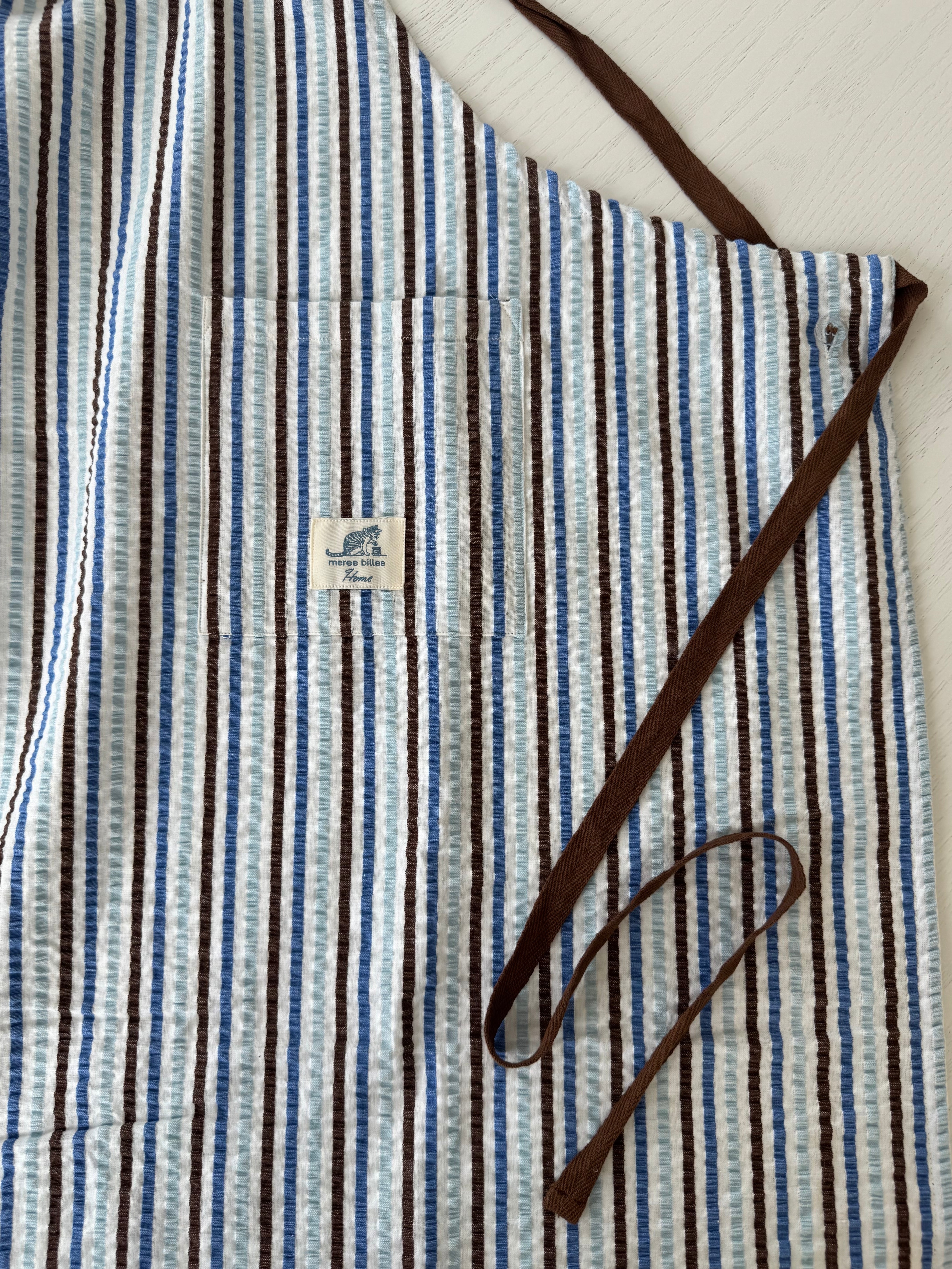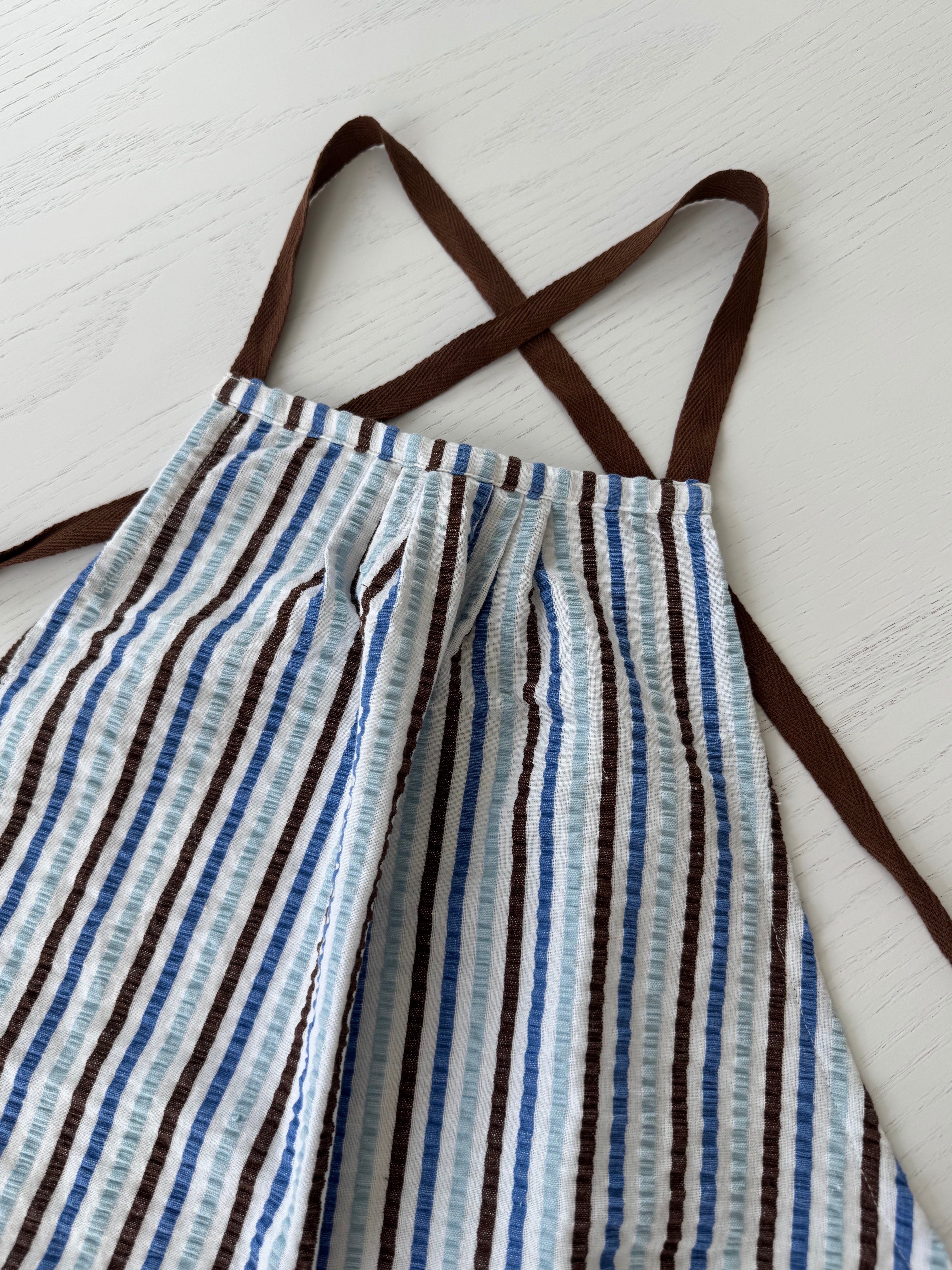 シアサッカー生地を使用した、軽やかな着心地のスタイリッシュなエプロン。
