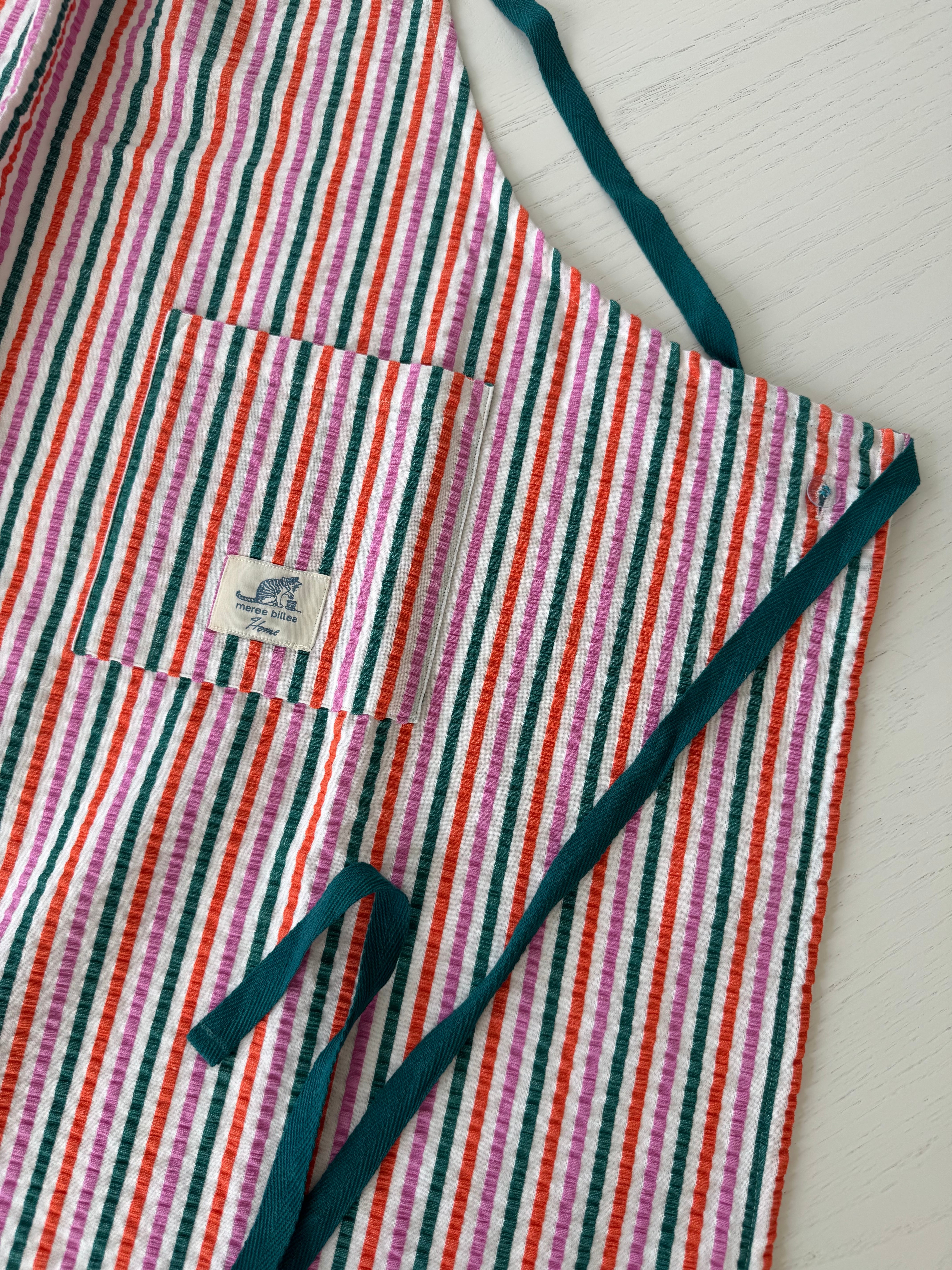 シアサッカー生地を使用した、軽やかな着心地のスタイリッシュなエプロン。