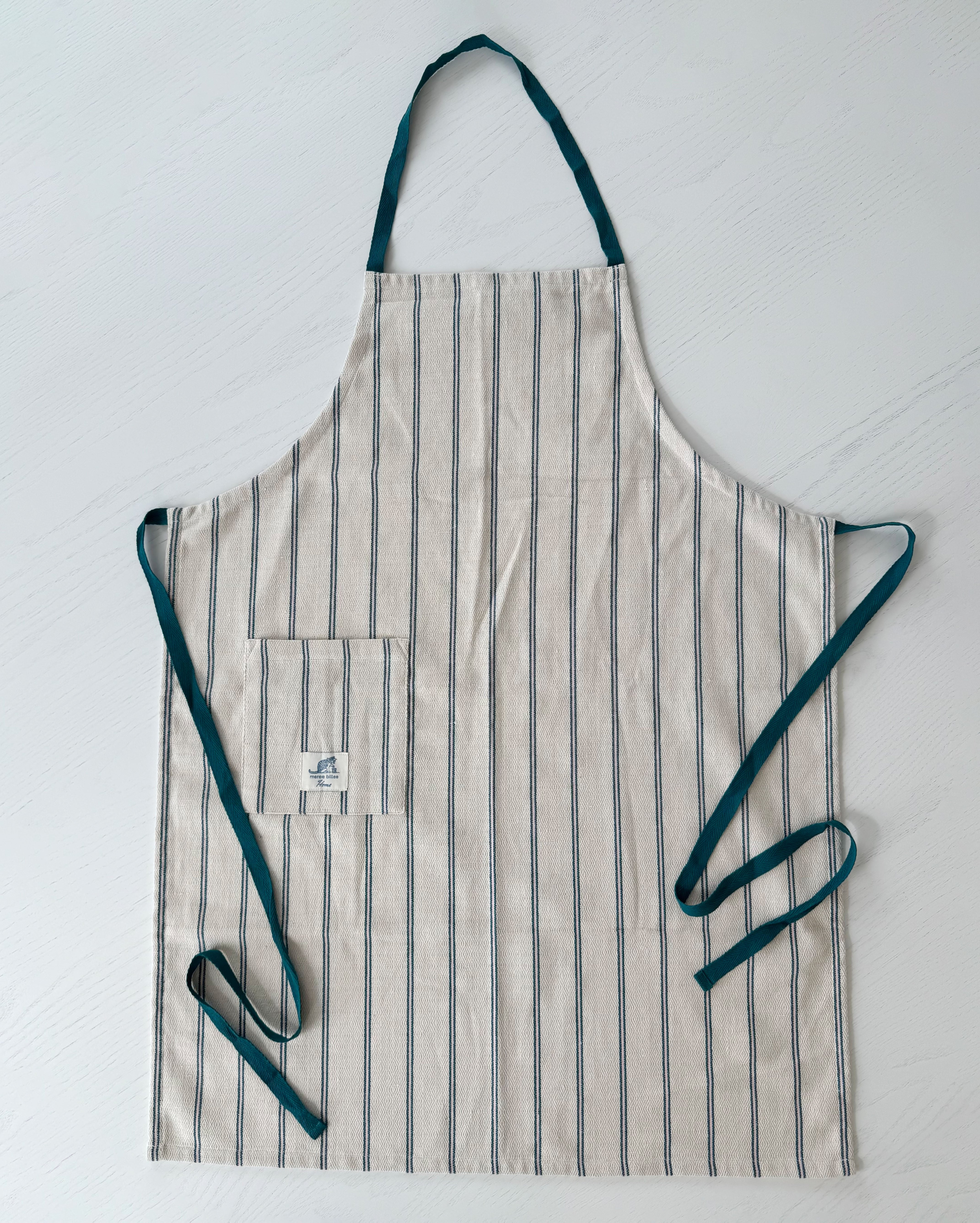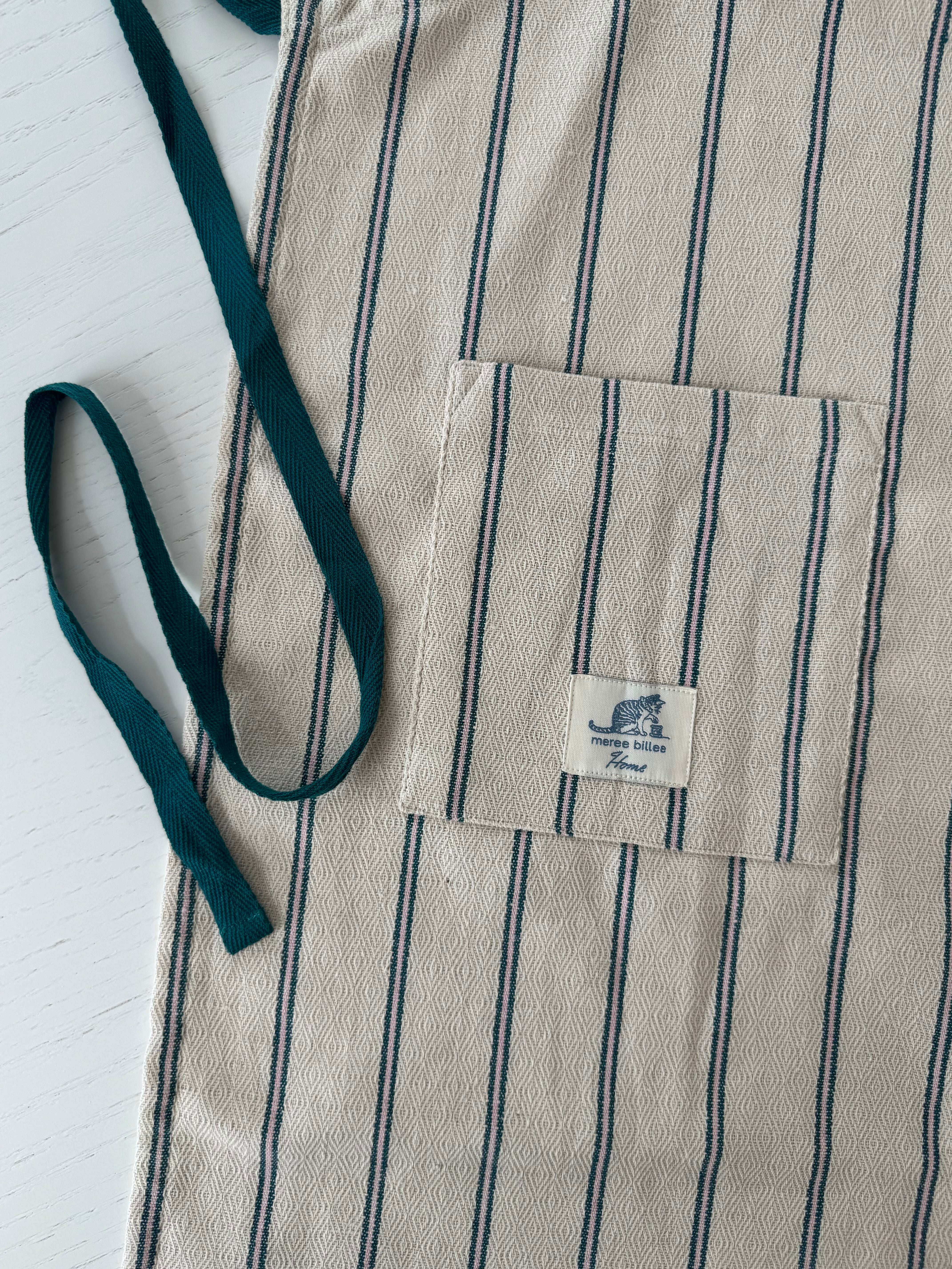 さりげない織り柄が入ったストライプ生地を使用したショートエプロン。