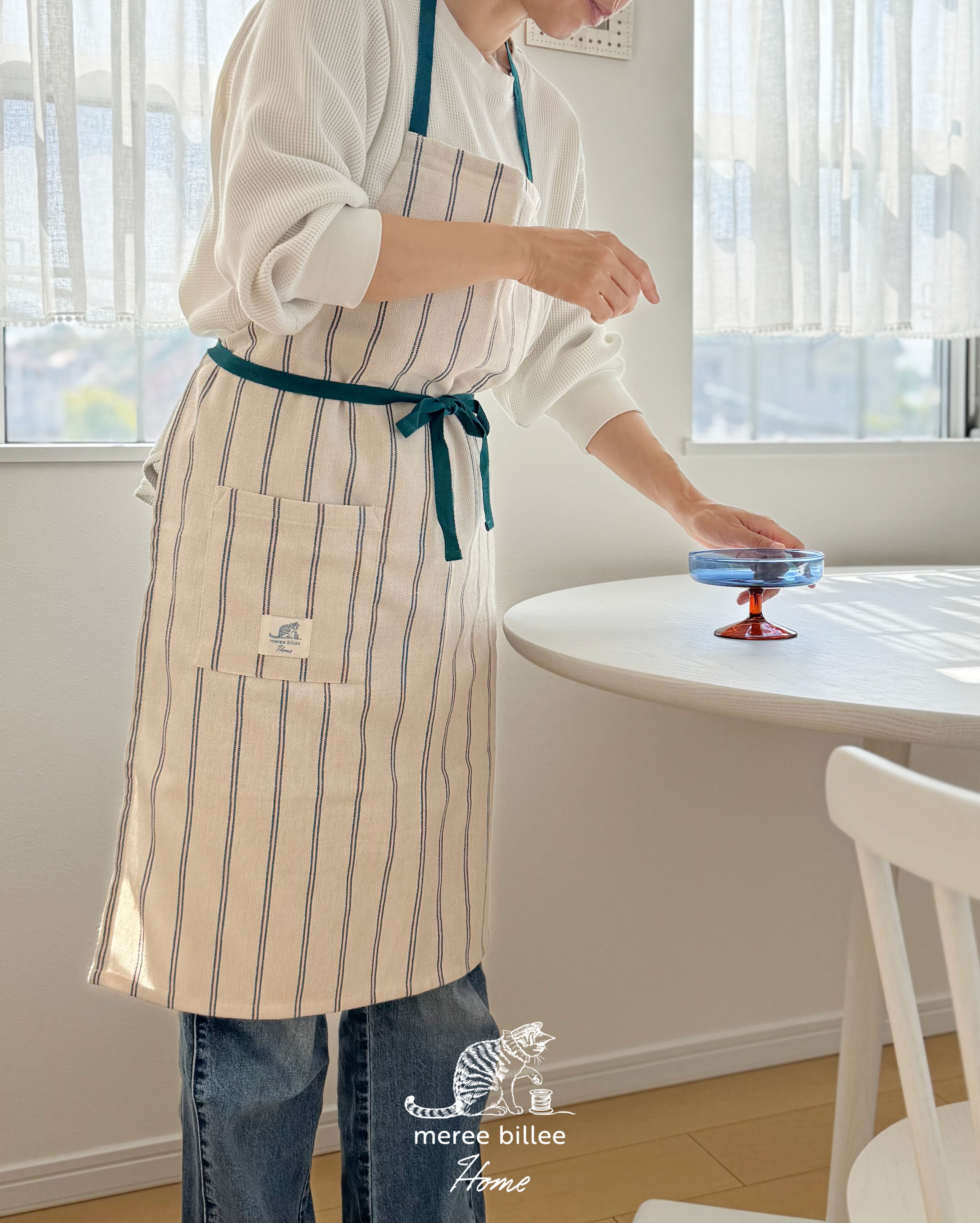 猫と暮らすショートエプロン|シンプルストライプ|軽量・速乾【アイボリー】