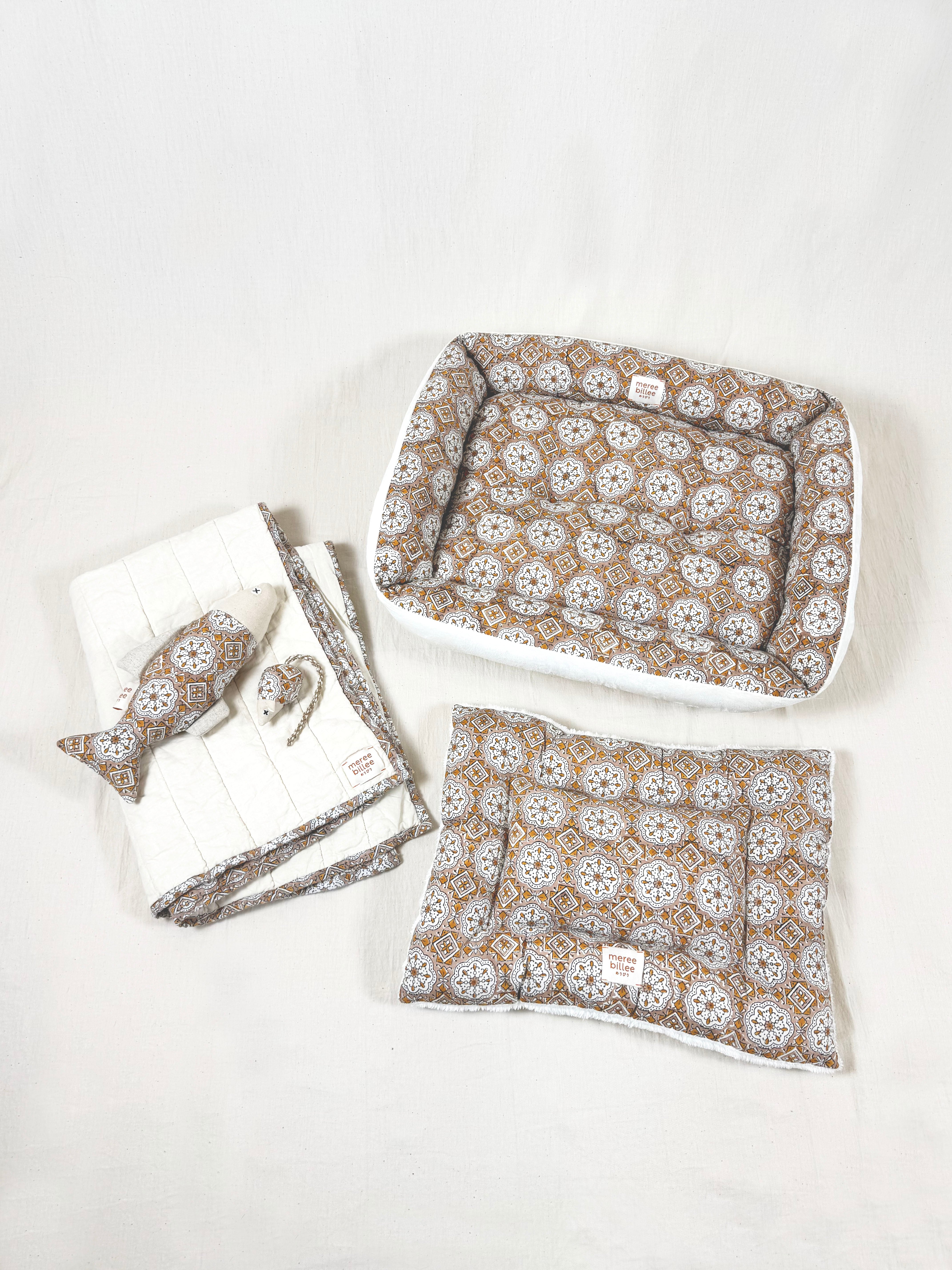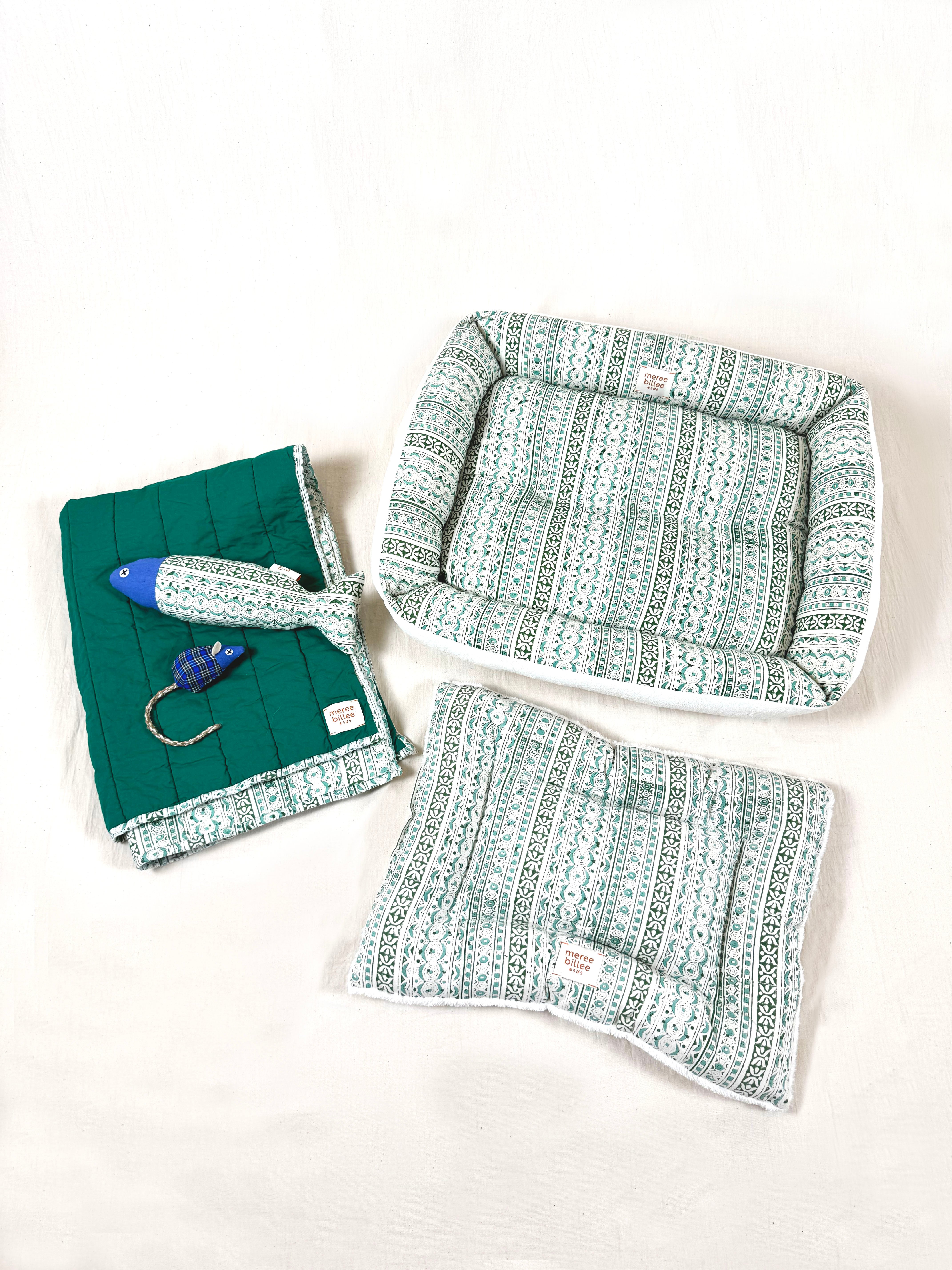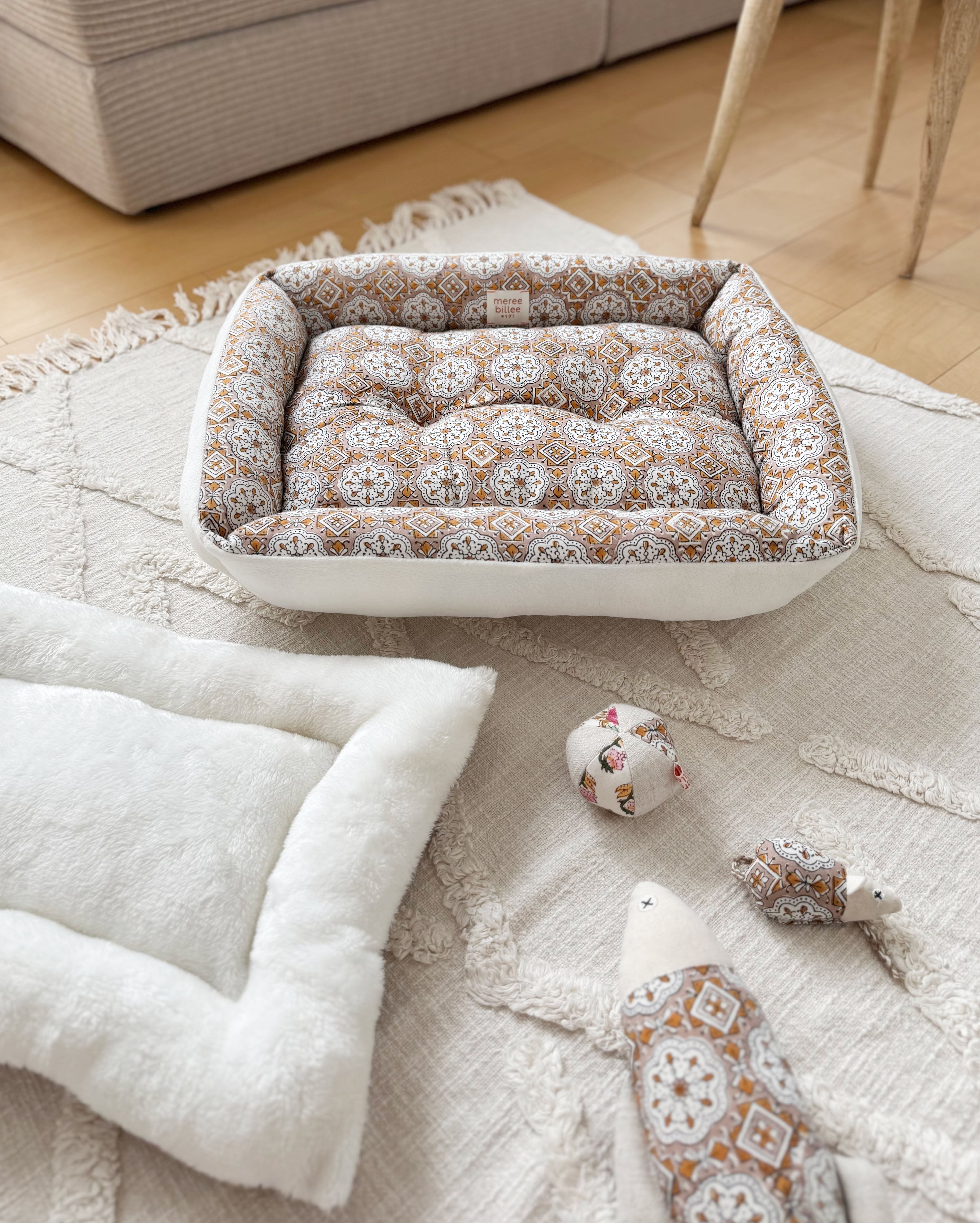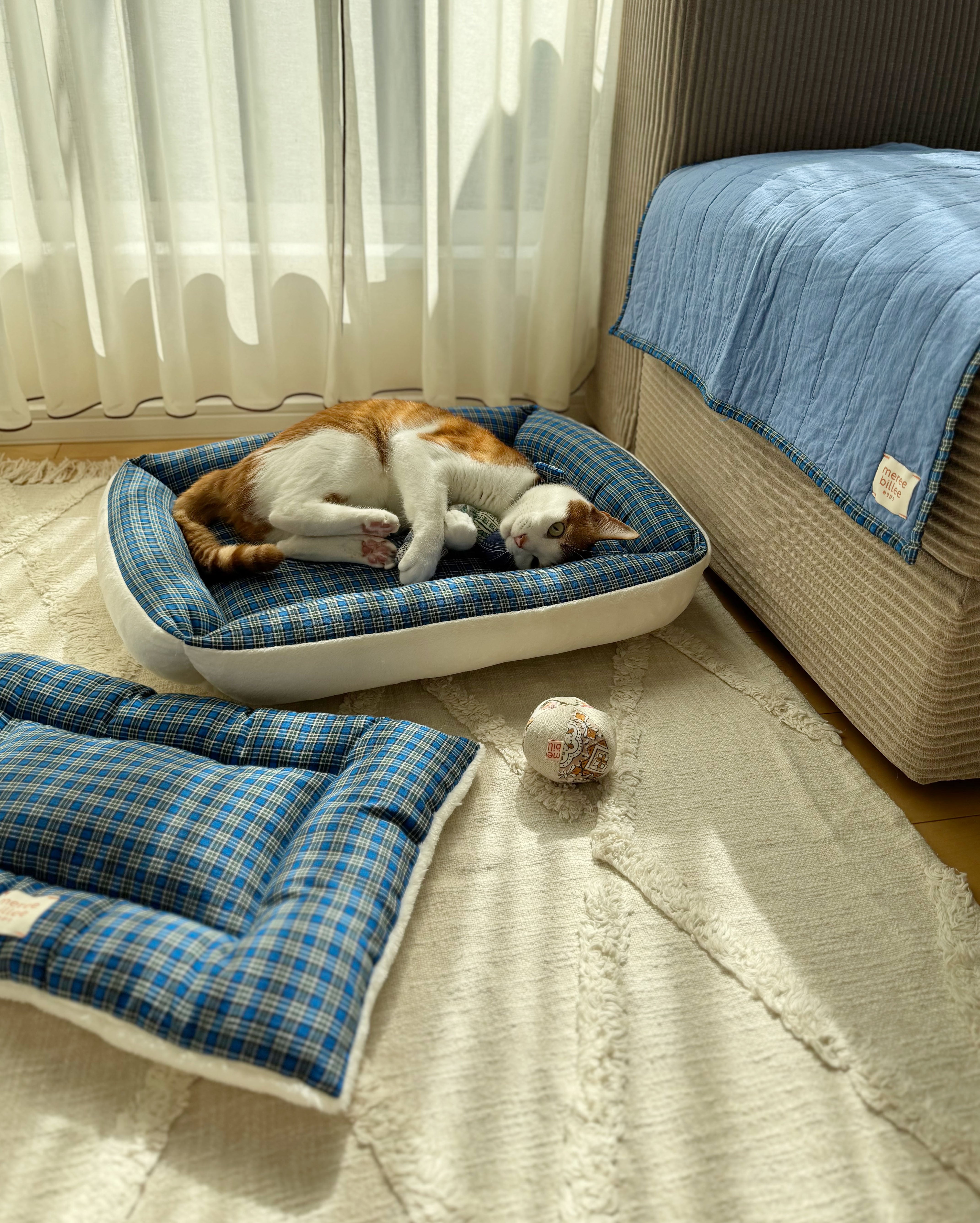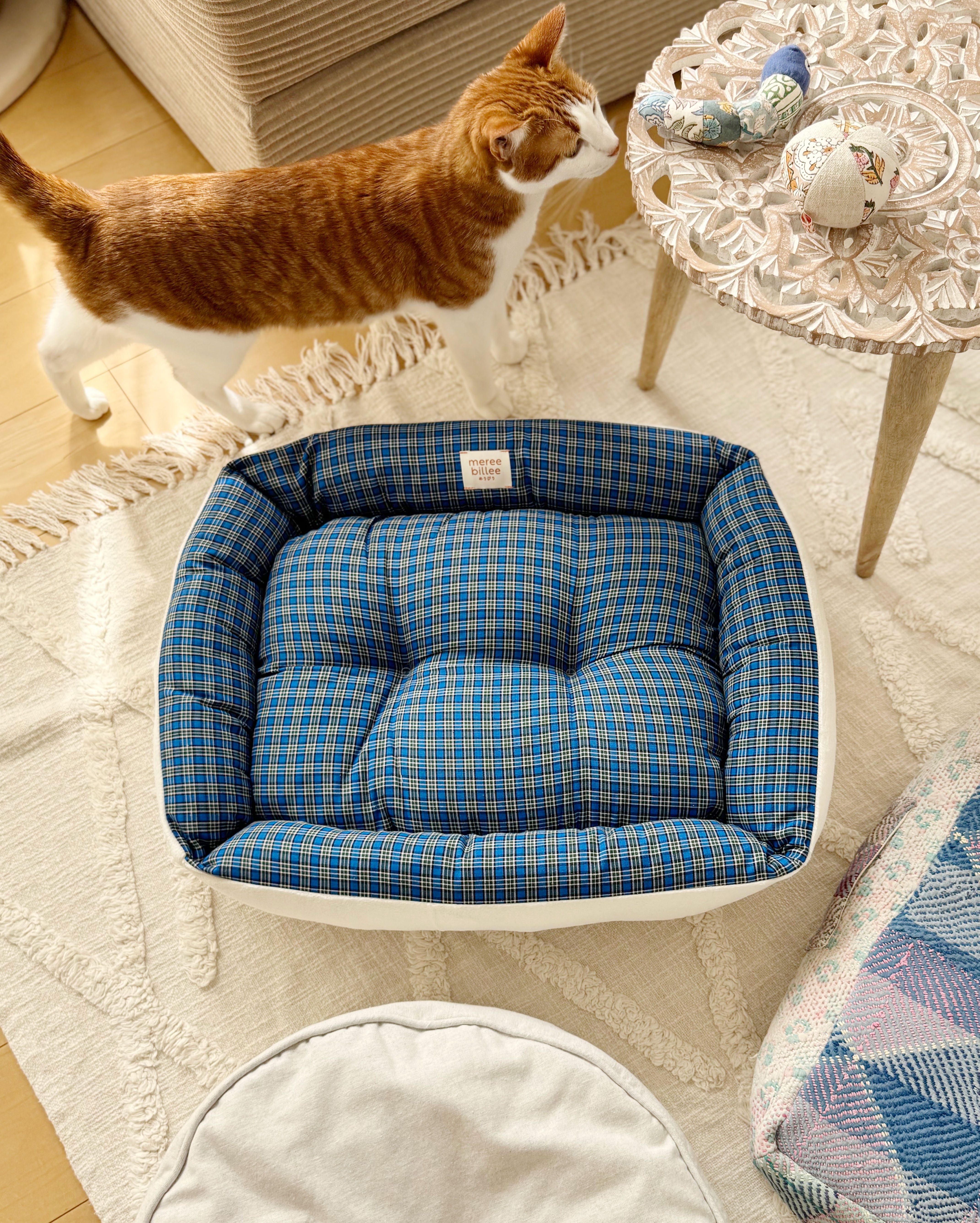 春夏にはさらっとしたインド綿の生地、秋冬には温かみのあるベルベット素材を使用した、両面リバーシブル仕様。ご自宅の洗濯機で丸洗いが可能。四隅には猫が心地よく顔を乗せられる縁がついています。中綿をたっぷりと詰め込むことで、快適な眠りをサポート。生地は二重仕立てで縫製しており、引っ掻きによる破れにも強く設計しました。