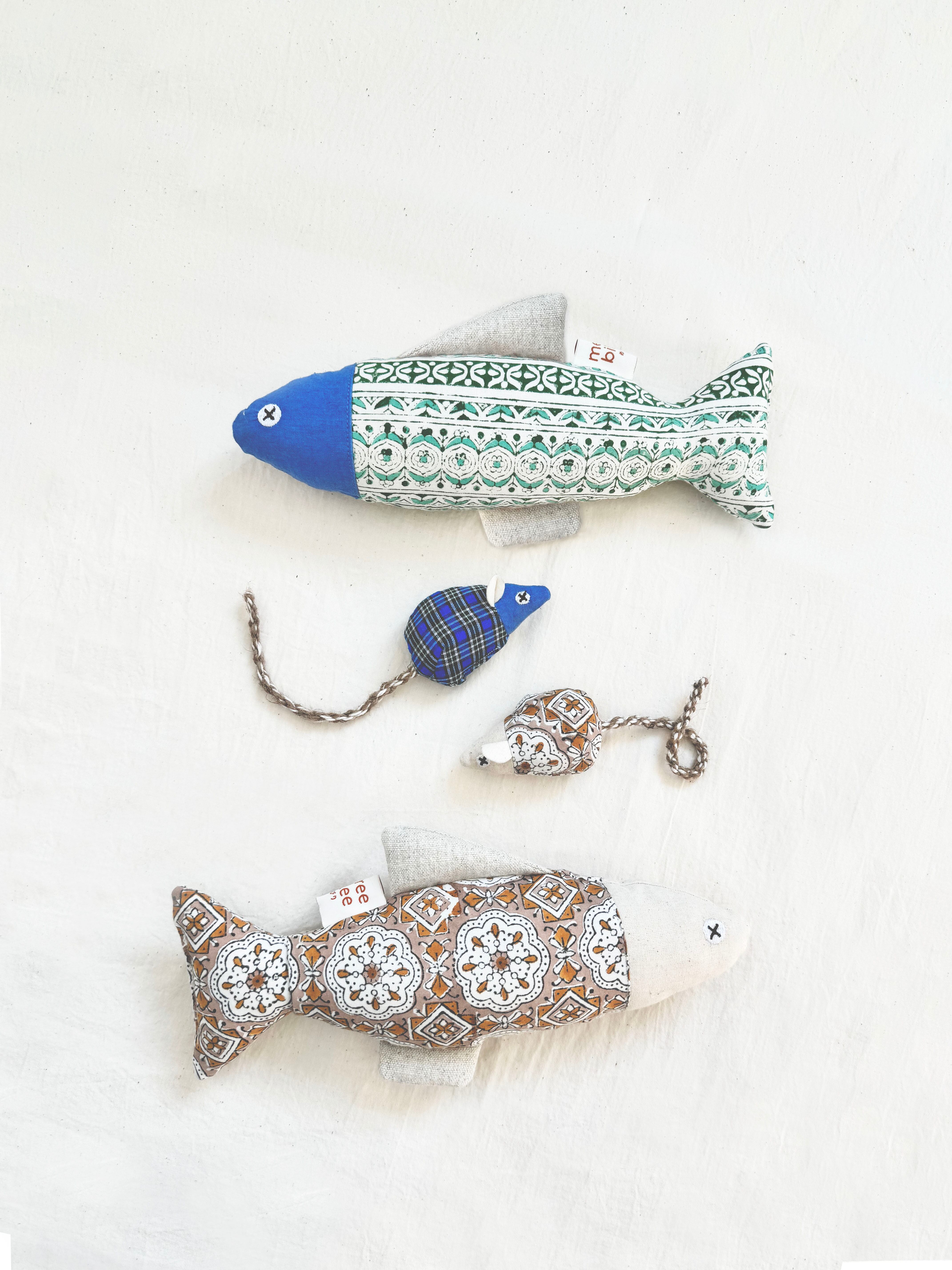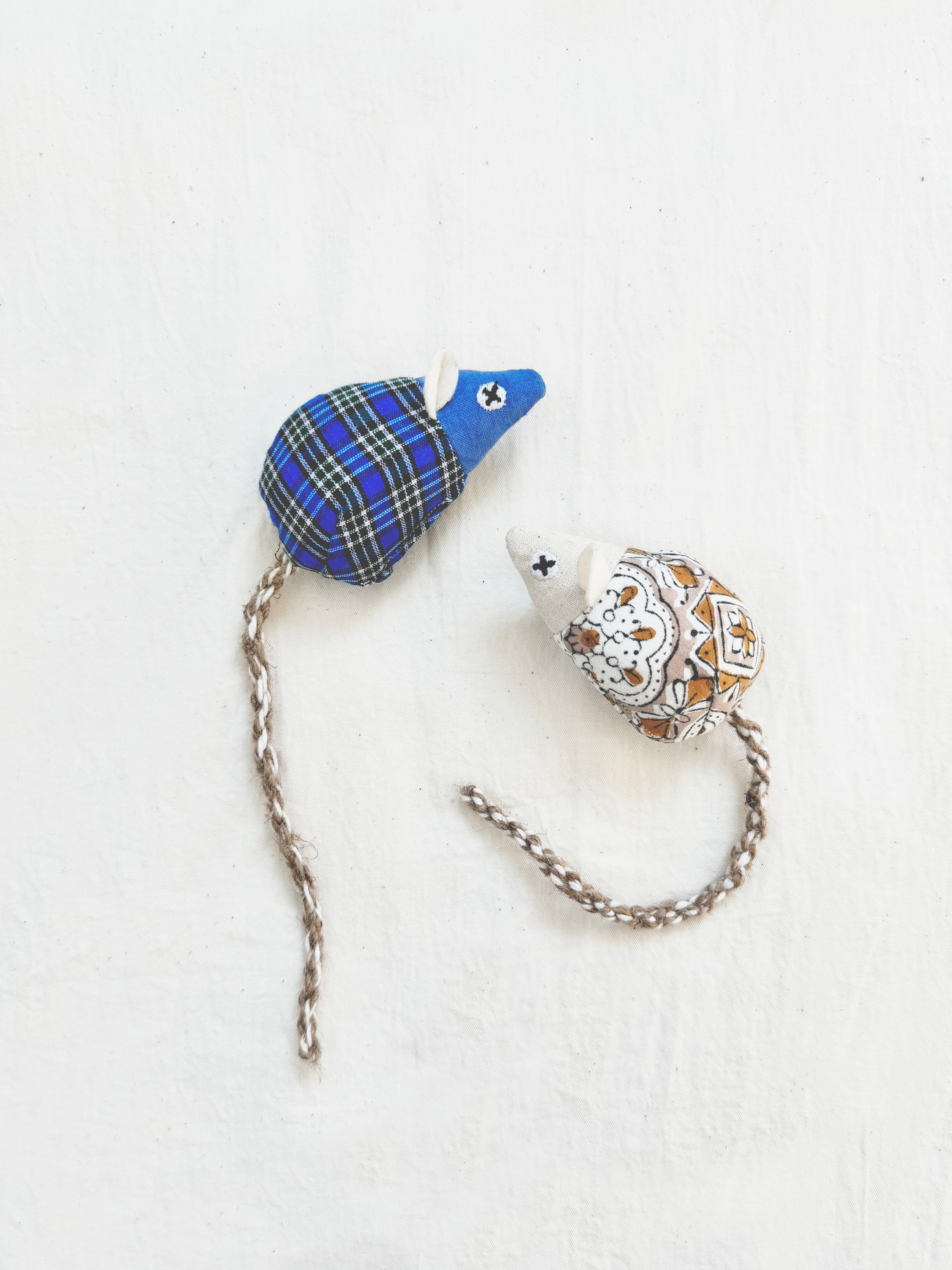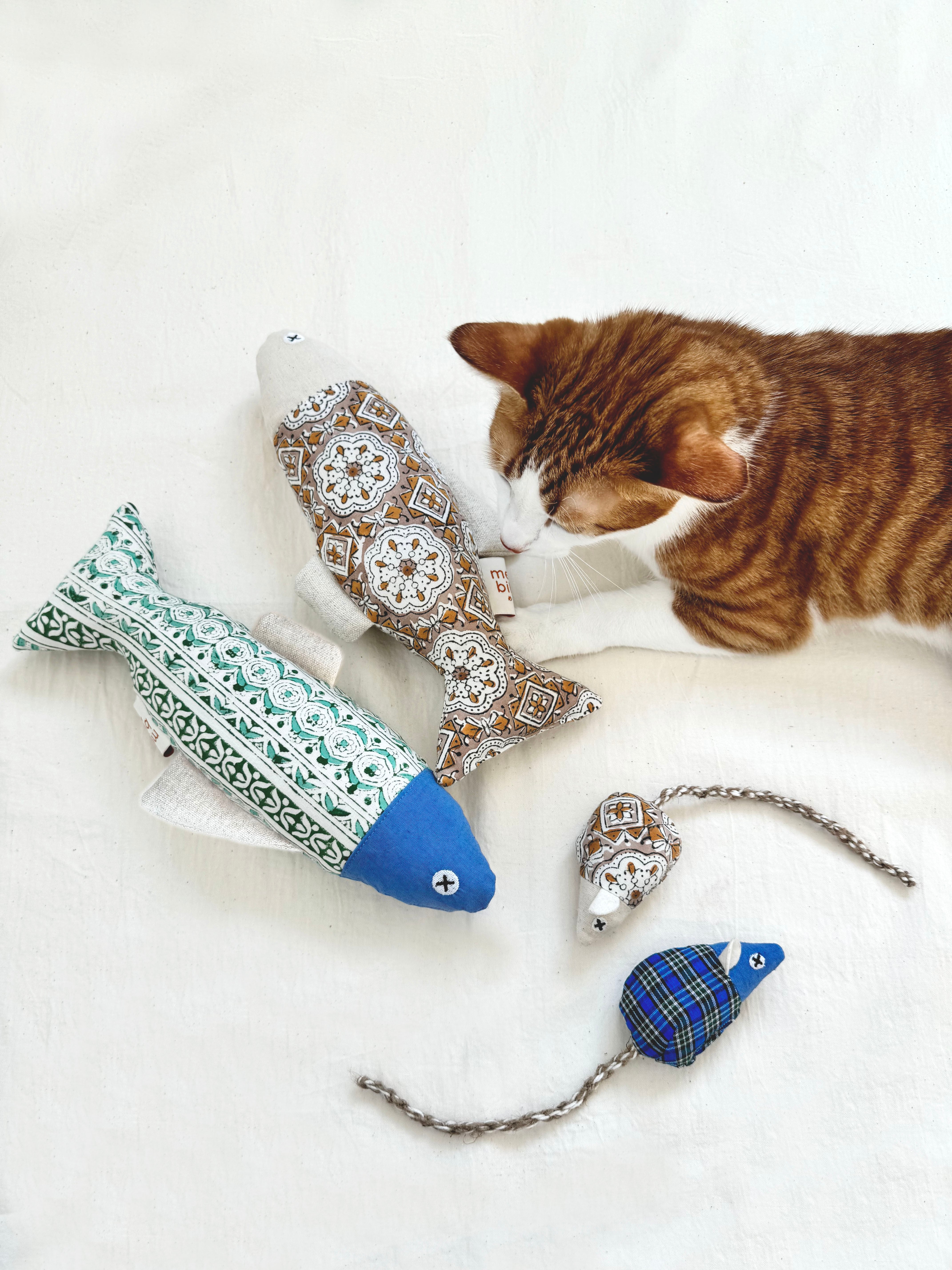 猫が蹴りやすいサイズにこだわった、2サイズのおもちゃセットです。中綿がたっぷりと詰め込まれており、しっかりとした反発力が特徴です。インドの生地を組み合わせ、床に転がっていてもインテリアとしてお楽しみいただけるようなデザインにしました。生地は二重仕立てで縫製しており、引っ掻きによる破れにも強く設計しました。万が一破損してしまった場合は、お気に入りのハギレを使ってパッチワーク補修を楽しむのもおすすめです。